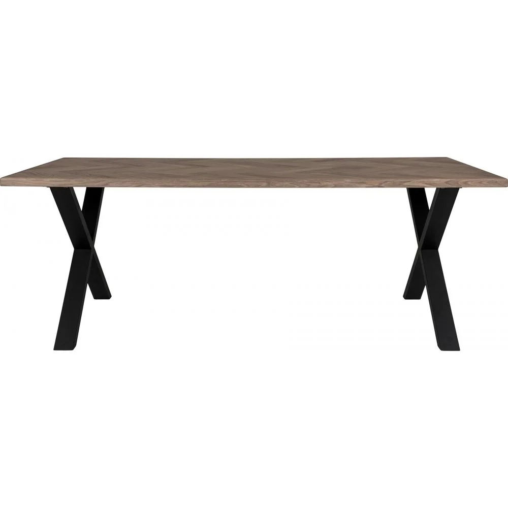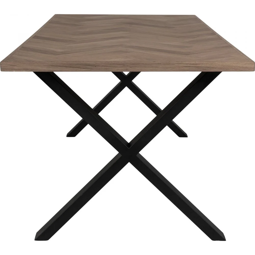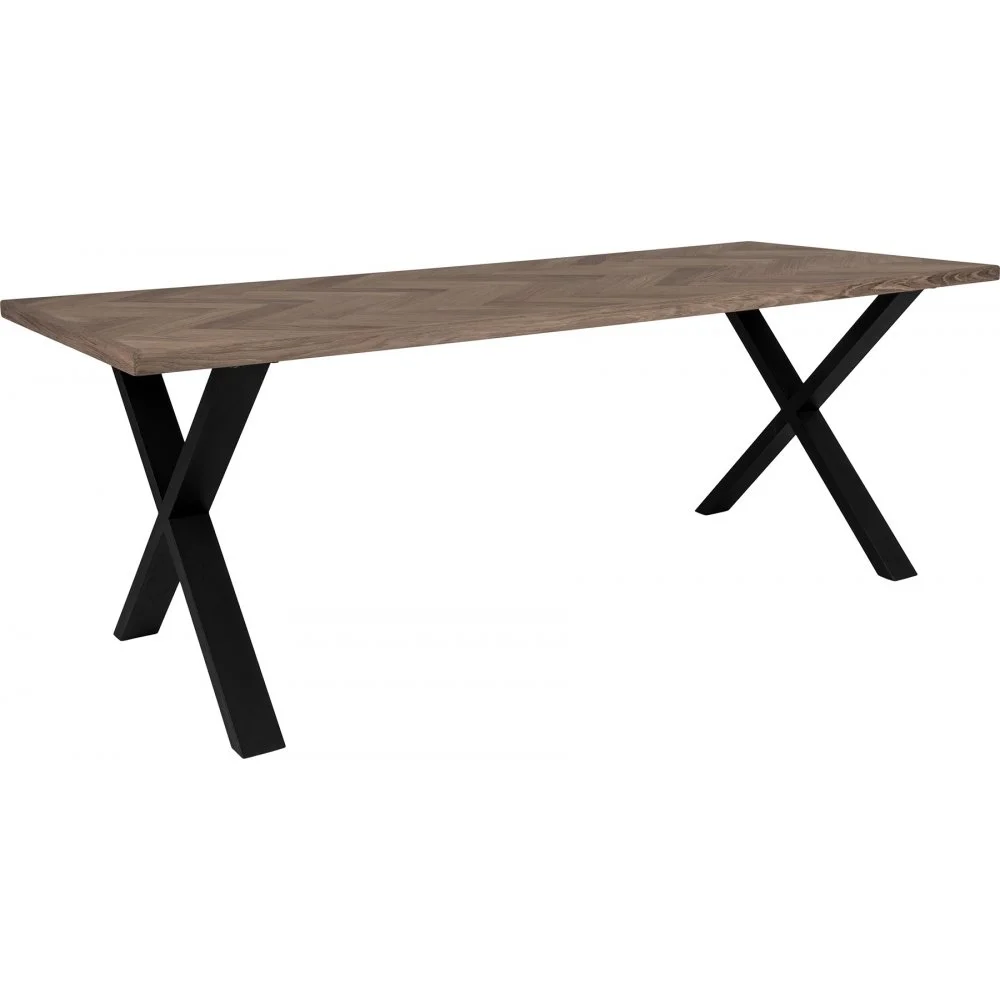 Fiskbensmönstrat matbord av MDF och ekfaner med underrede av stål.