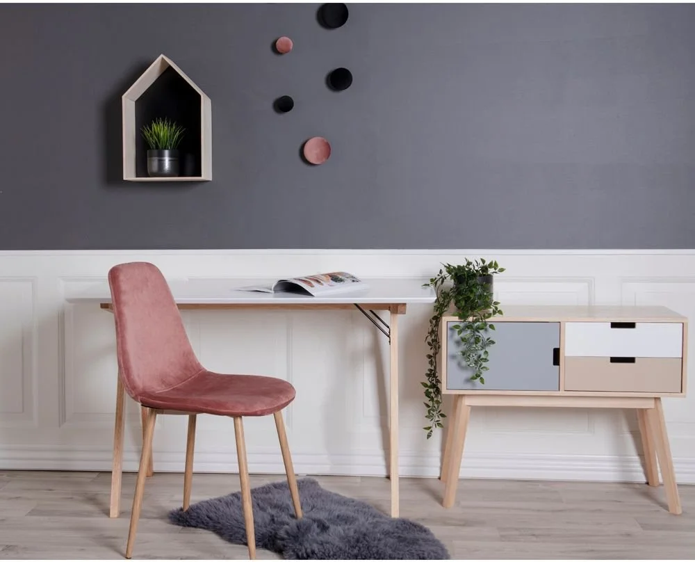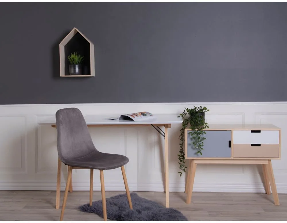 Skrivbord i vitt och naturligt trä.
