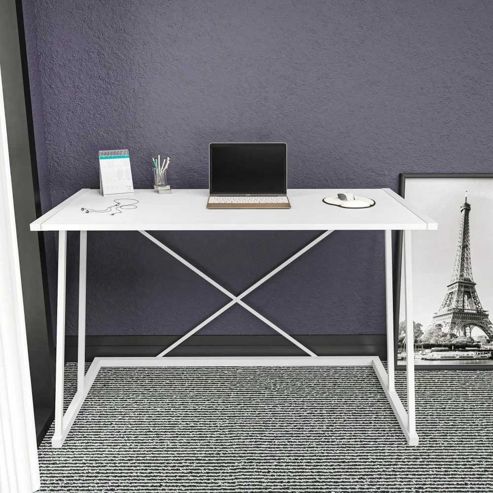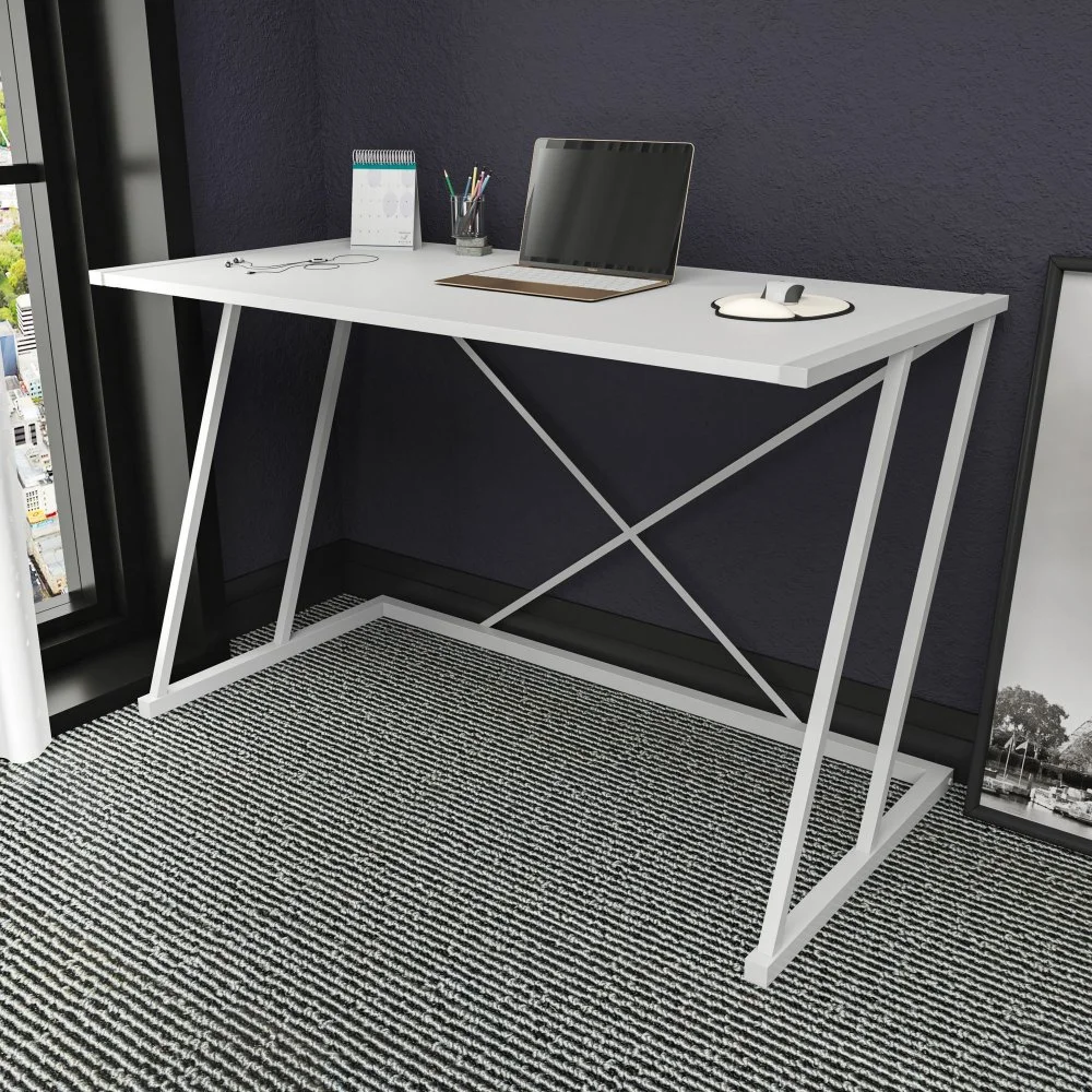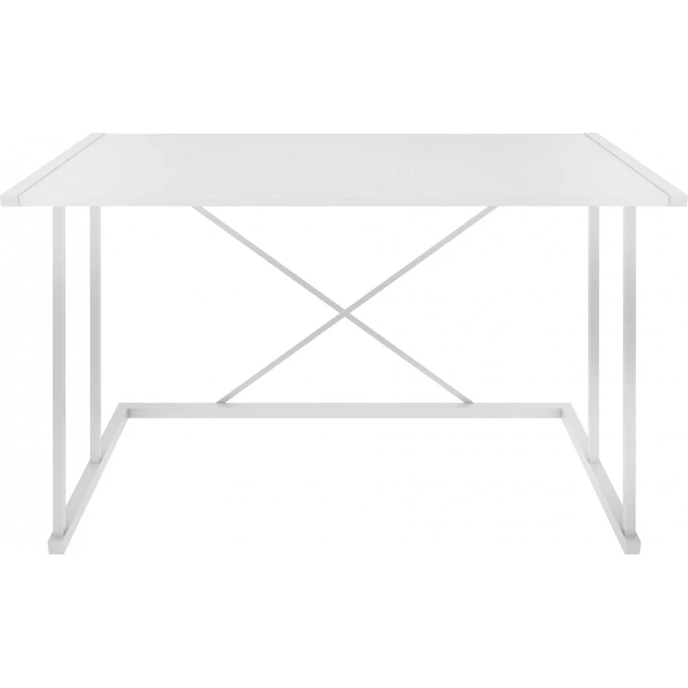 Skrivbord av metall med bordsskiva av trä.