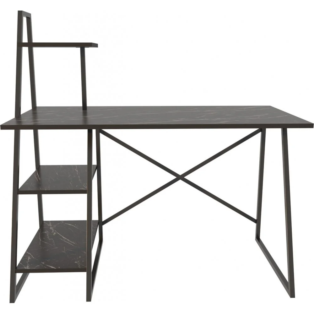 Skrivbord av metall med bordsskiva av trä.