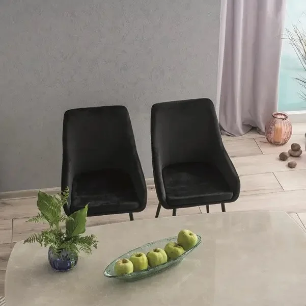 Matstol i metall. Klädd med polyester i sammetsimitation.