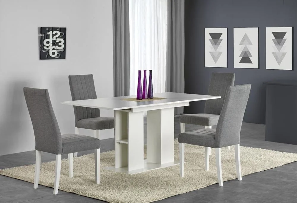 Ett modern matbord med en robust design. Bordet är tillverkat i vitlackerad MFP (premium träskiva) med ett kraftigt och stadigt underrede och slät bordsskiva. Bordet är praktiskt då det lätt kan förlängas från 130 cm till 170 cm, perfekt för tillfällen med lite större sällskap.
