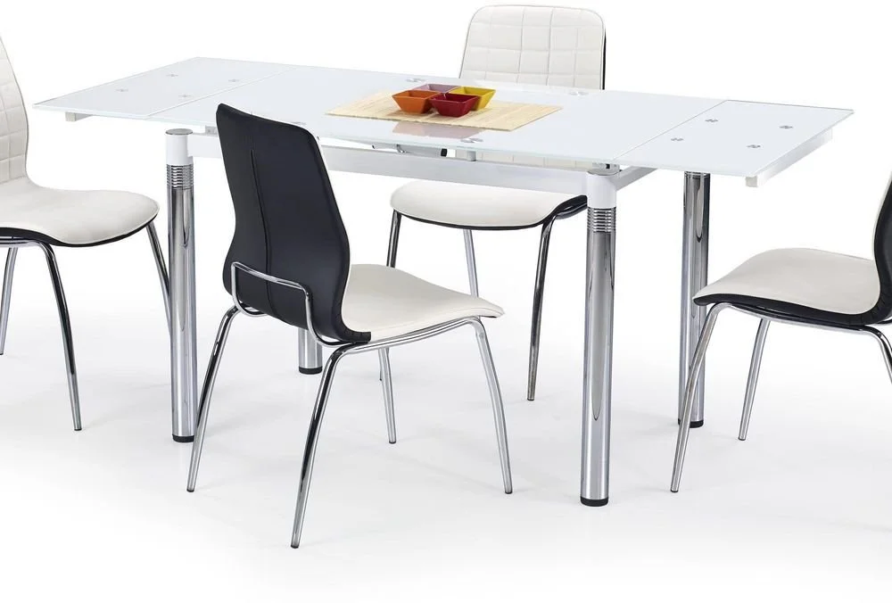 Ett snyggt matbord med en modern design. Underredet är tillverkat i kromad metall med detaljer i vitt. Bordsskivan är i vitt glas. Bordet är praktiskt då det lätt kan förlängas från 110 cm till 170 cm, perfekt för tillfällen med lite större sällskap.