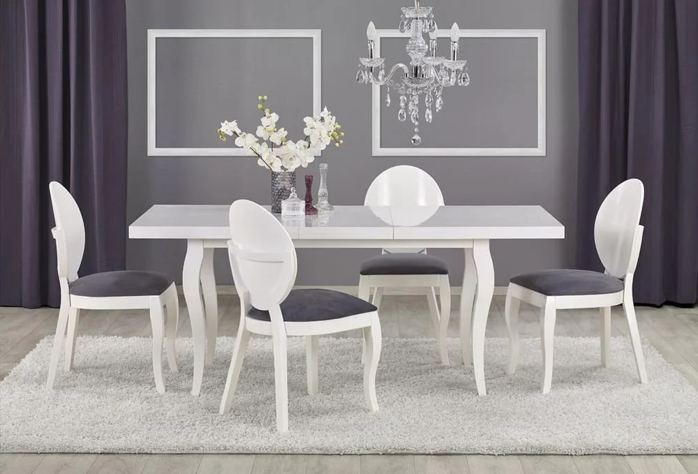 Ett elegant matbord med en klassisk design. Underredet är tillverkat i massiv bok och bordsskivan är av vitlackerad MFP (premium träskiva). Bordet är praktiskt då det lätt kan förlängas från 140 cm till 180 cm, perfekt för tillfällen med lite större sällskap.