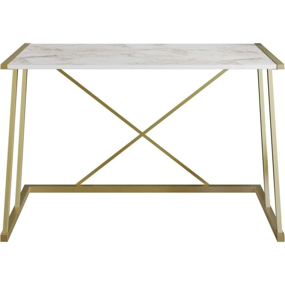 Skrivbord av trä och metall.
