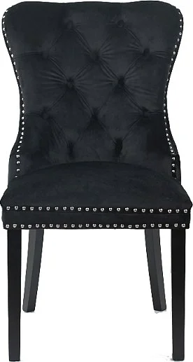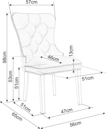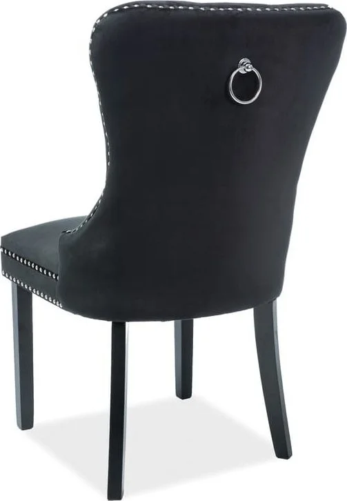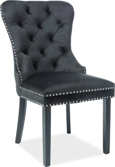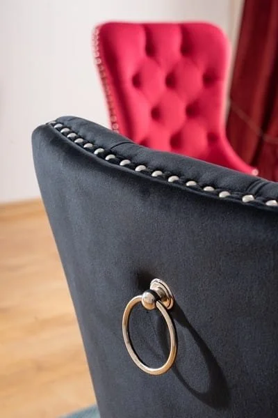 Matstol i metall. Klädd med polyester i sammetsimitation. Metallring på ryggen.