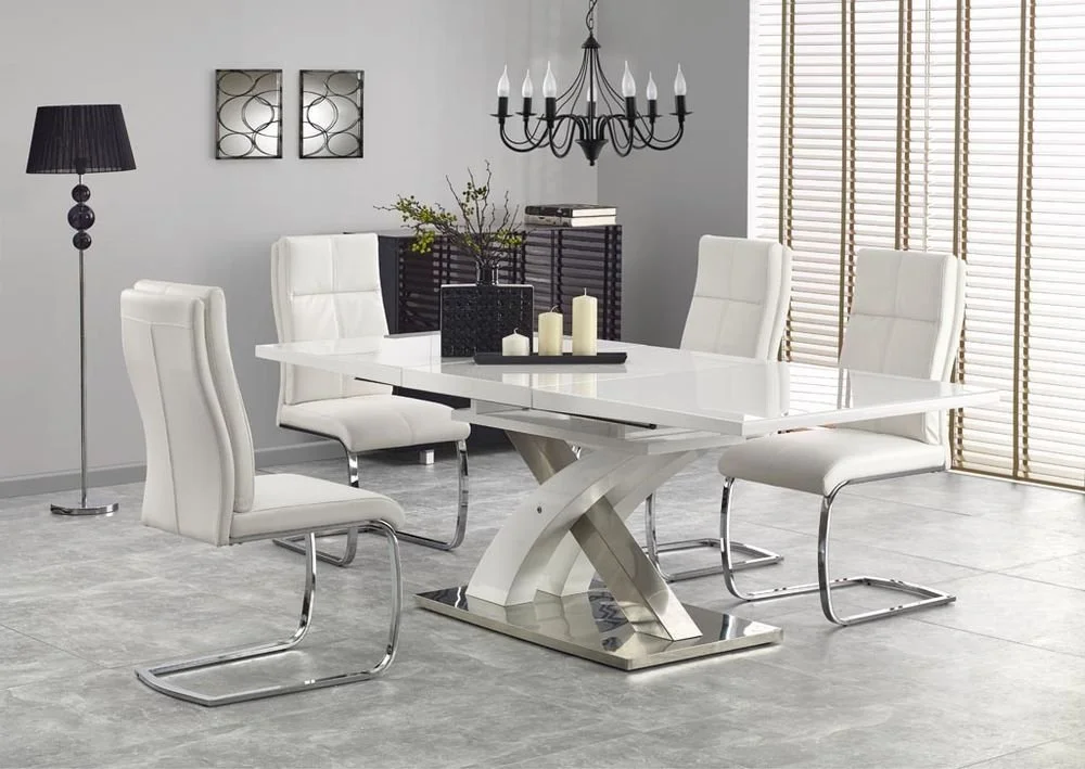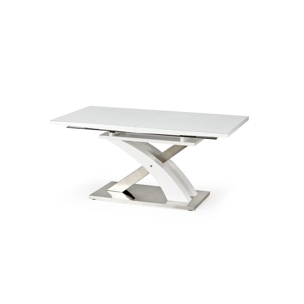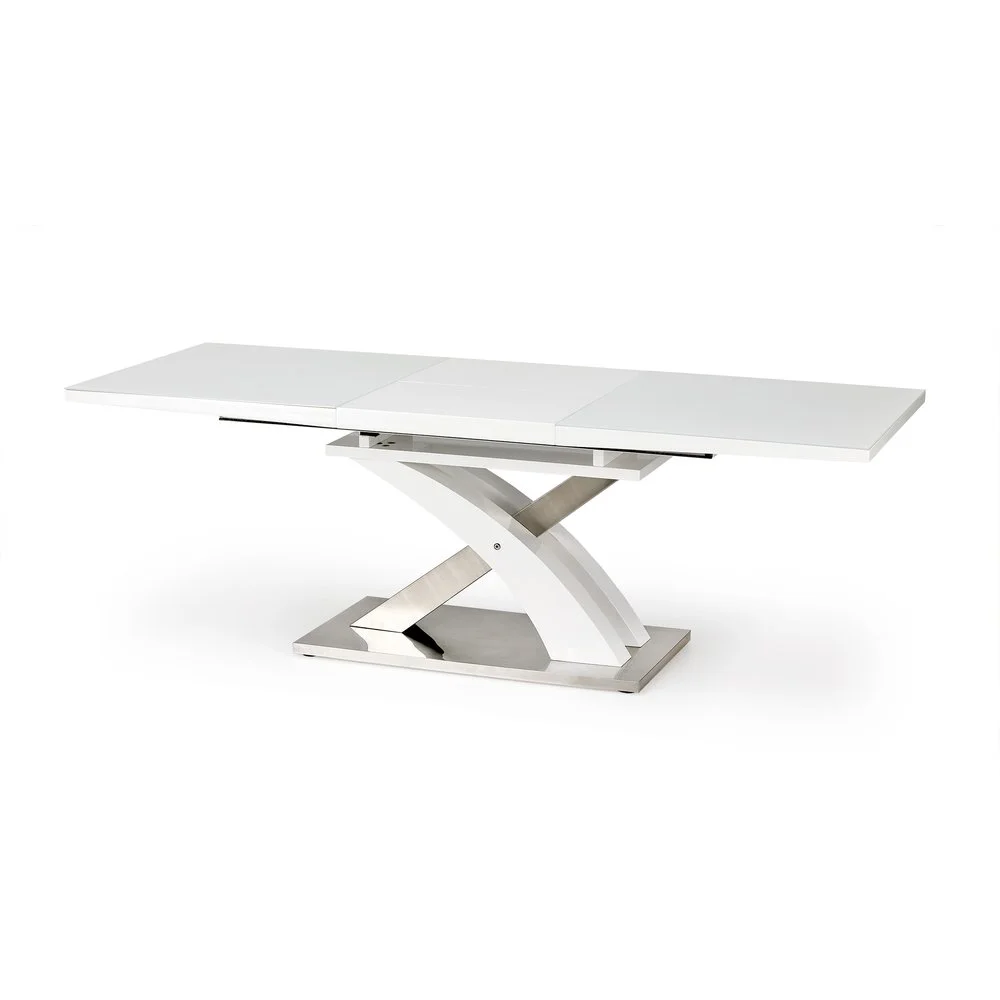 Ett elegant matbord med en modern design. Underredet är tillverkat i lackerad & kromad metall och MFP (premium träskiva), bordsskivan är i vitlackerad MFP (premium träskiva) med tåligt glas. Bordet kan lätt förlängas från 160 cm till 220 cm, perfekt när man har ett lite större sällskap.