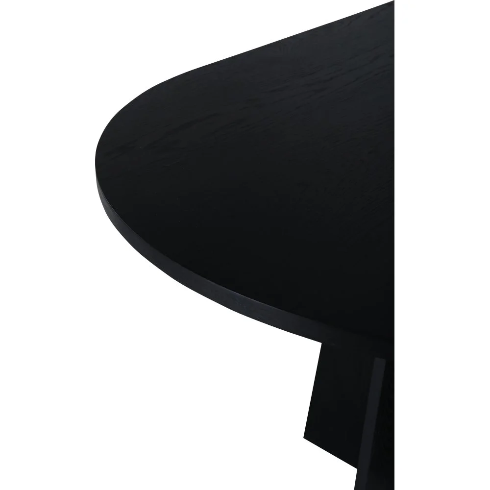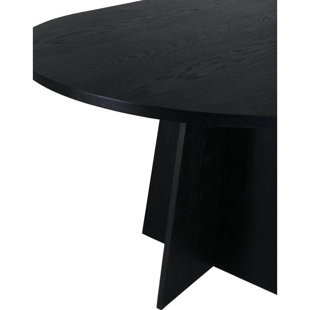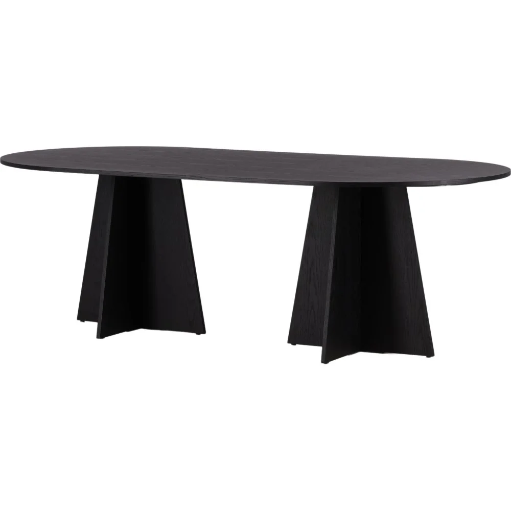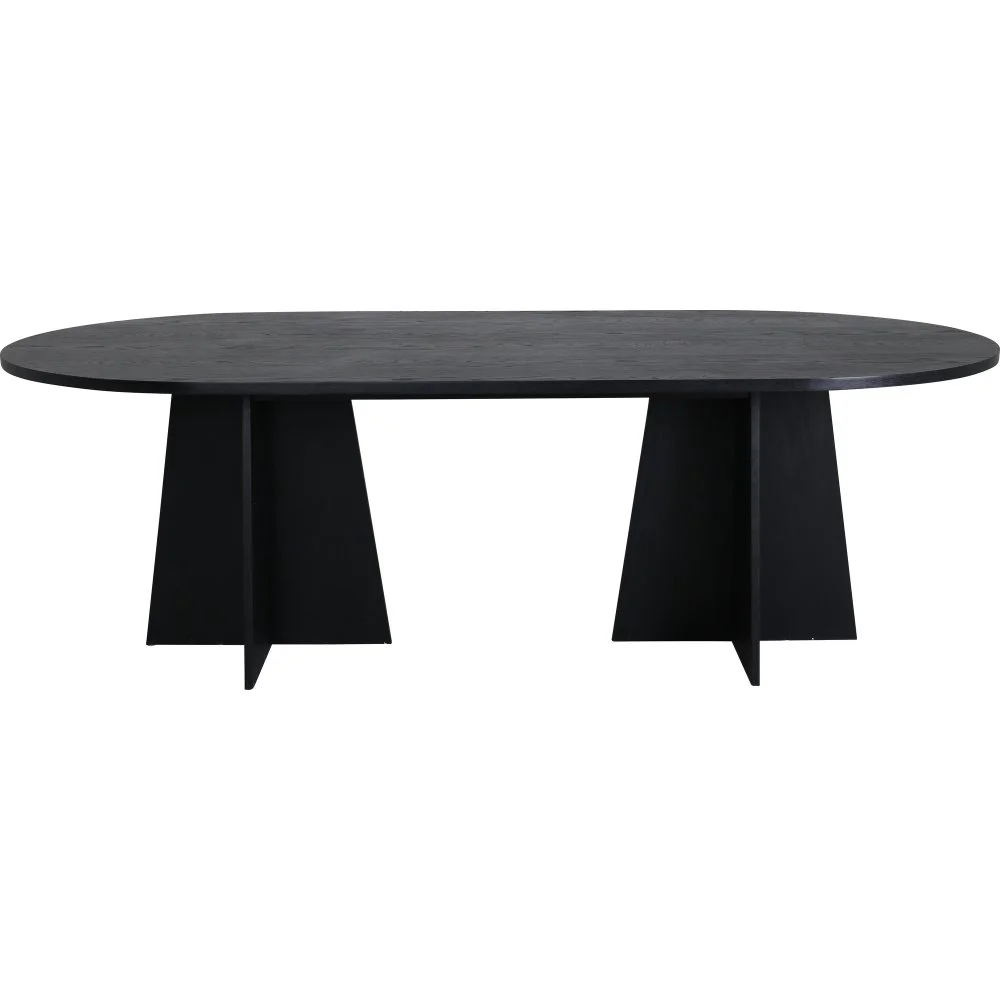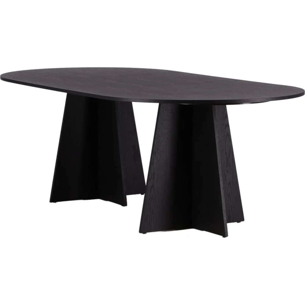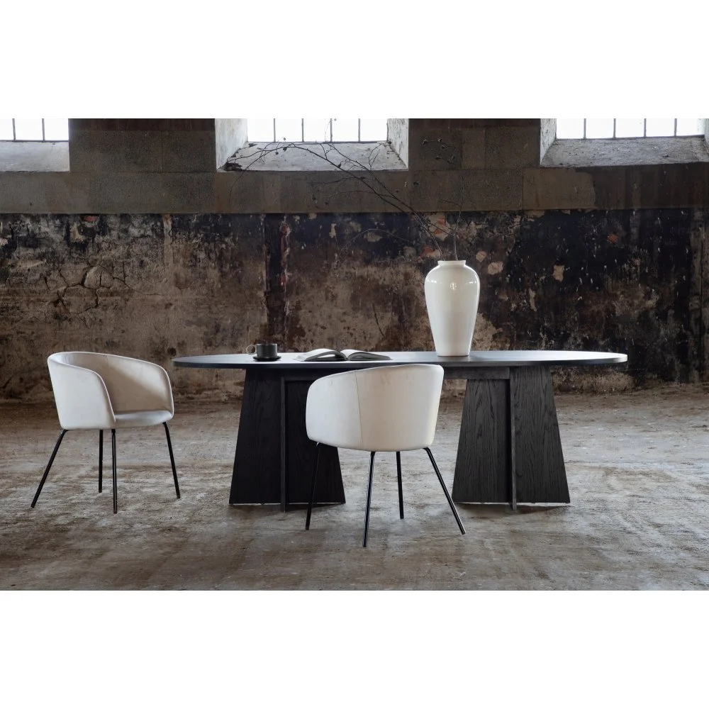 Matbord som har en unik design med en oval bordsskiva i svart MDF med fanéer och en säregen stomme med två konformade ben i öppen design. Den tunna bordsskivan skapar ett minimalistiskt intryck och är en smakfull kontrast till den mer robusta stommen. Matcha med ett par bekväma matstolar så får du en komplett matgrupp som står sig över tid.