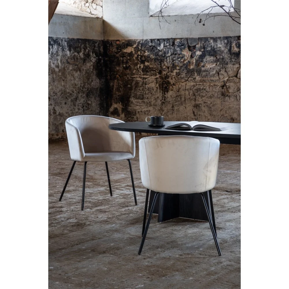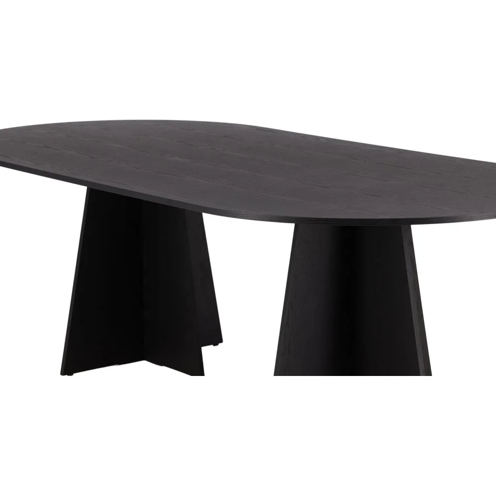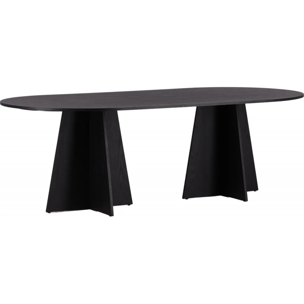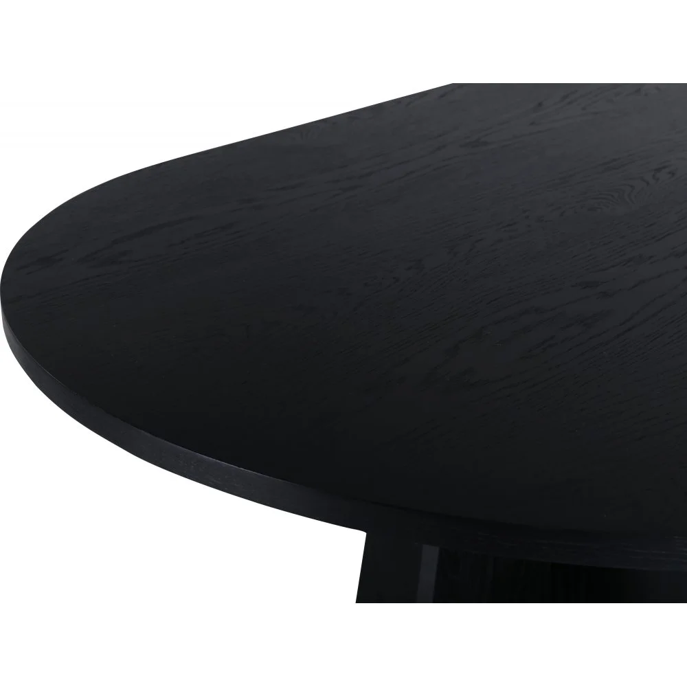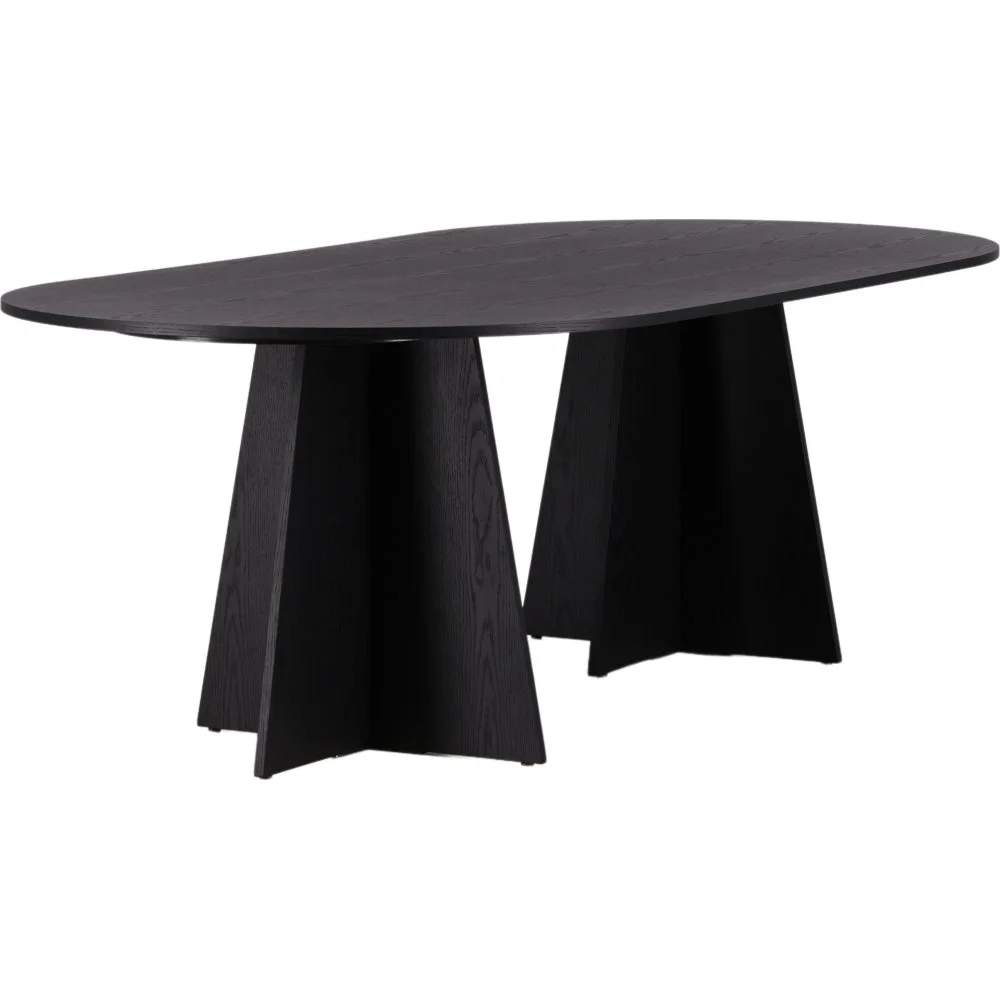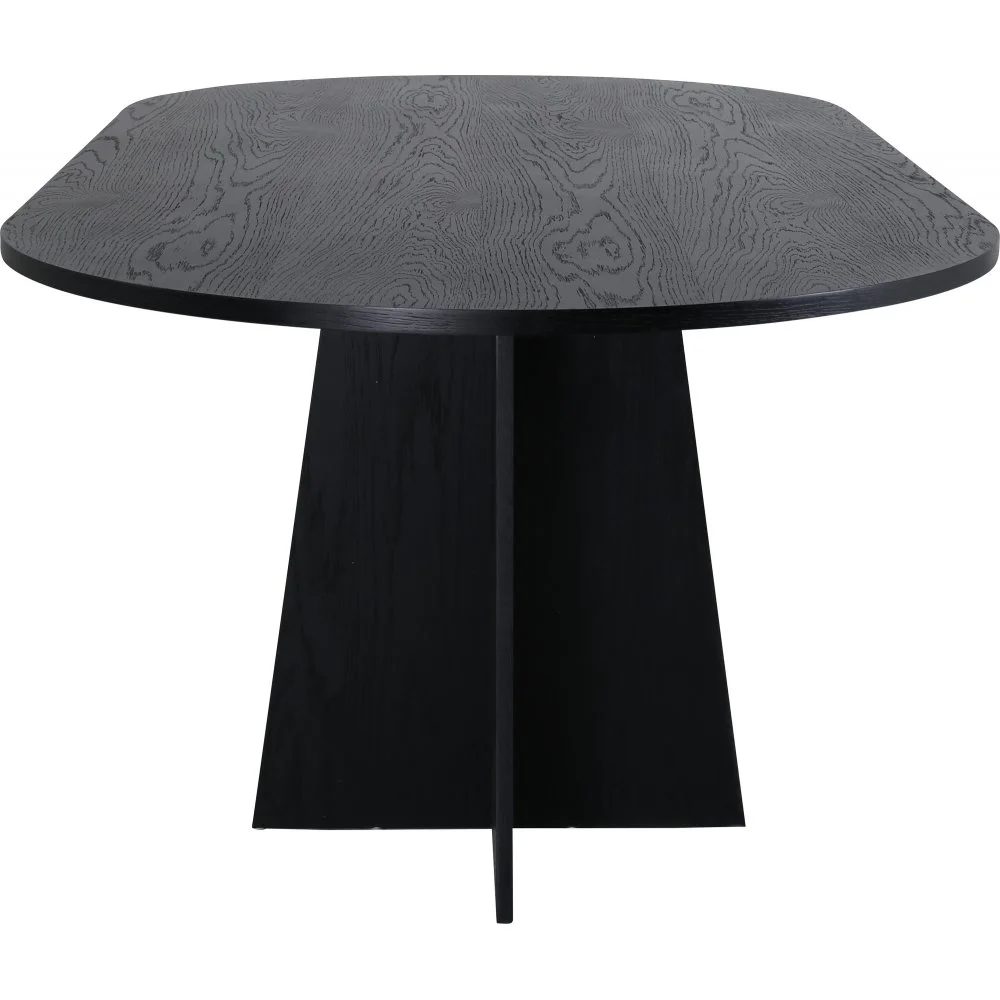 Matbord som har en unik design med en oval bordsskiva i svart MDF med fanéer och en säregen stomme med två konformade ben i öppen design. Den tunna bordsskivan skapar ett minimalistiskt intryck och är en smakfull kontrast till den mer robusta stommen. Matcha med ett par bekväma matstolar så får du en komplett matgrupp som står sig över tid.