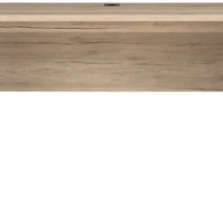 En fint och stilrent skrivbord i ekimitaion med grafitgråa sidor. Undertill finns en vågrät skiva som skyddar väggen från smuts men som också hjälper till att stabilisera skrivbordet. Uppe på bordskivan finns ett praktiskt kabelhål.