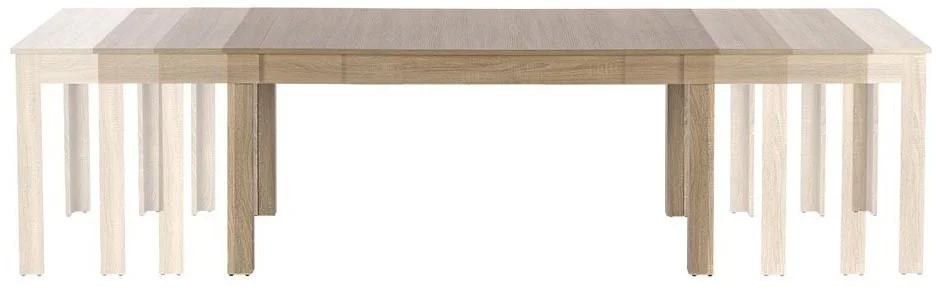 Ett robust matbord med en klassisk design. Tillverkat helt i MFP (premium träskiva) med ljus ek-laminat och slät bordsskiva. Bordet är praktiskt då det lätt kan förlängas från 160 cm till 300 cm, perfekt för tillfällen med lite större sällskap.