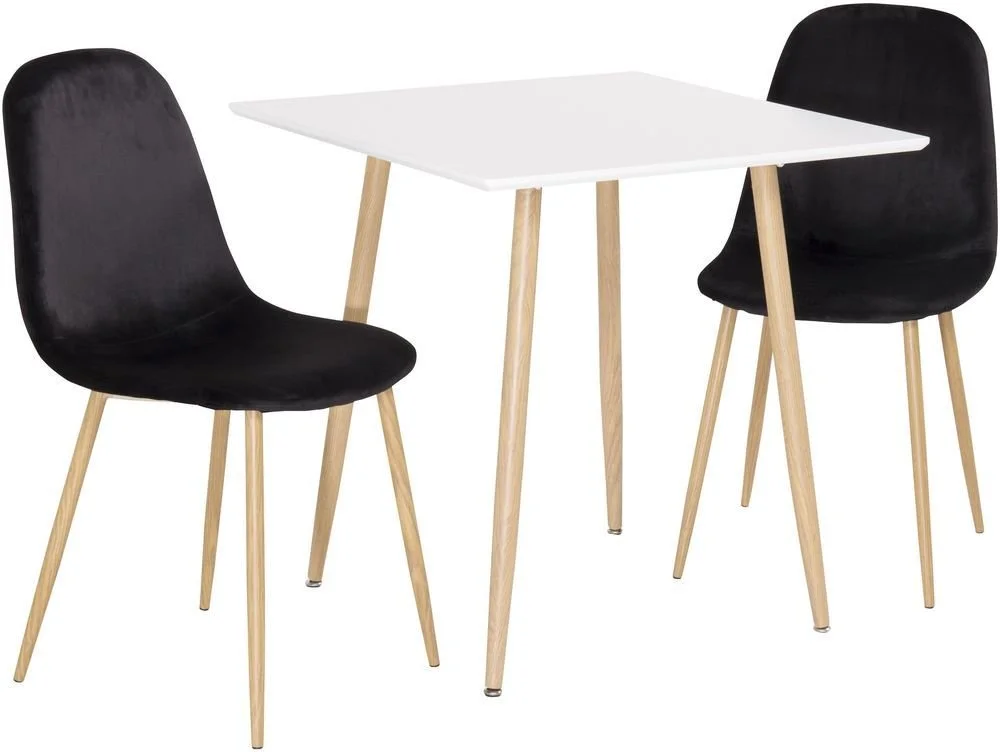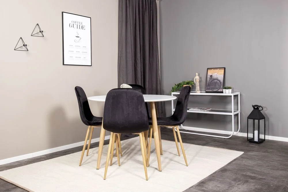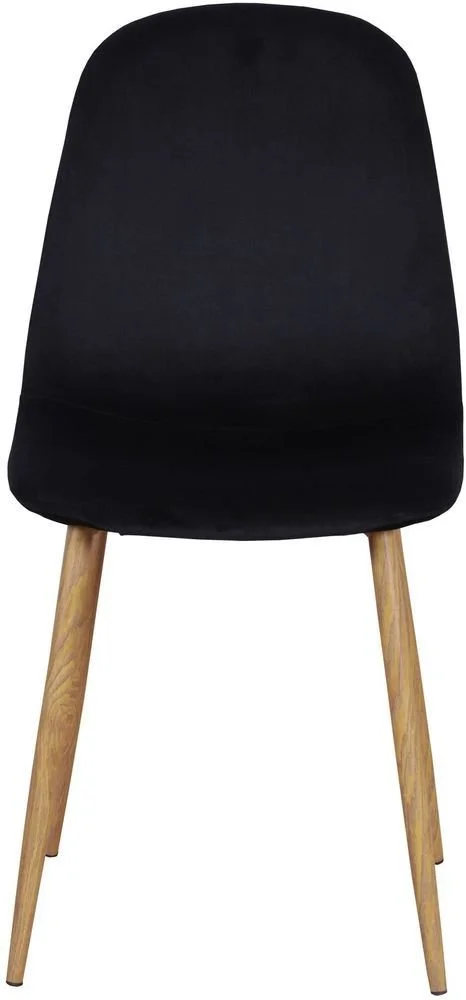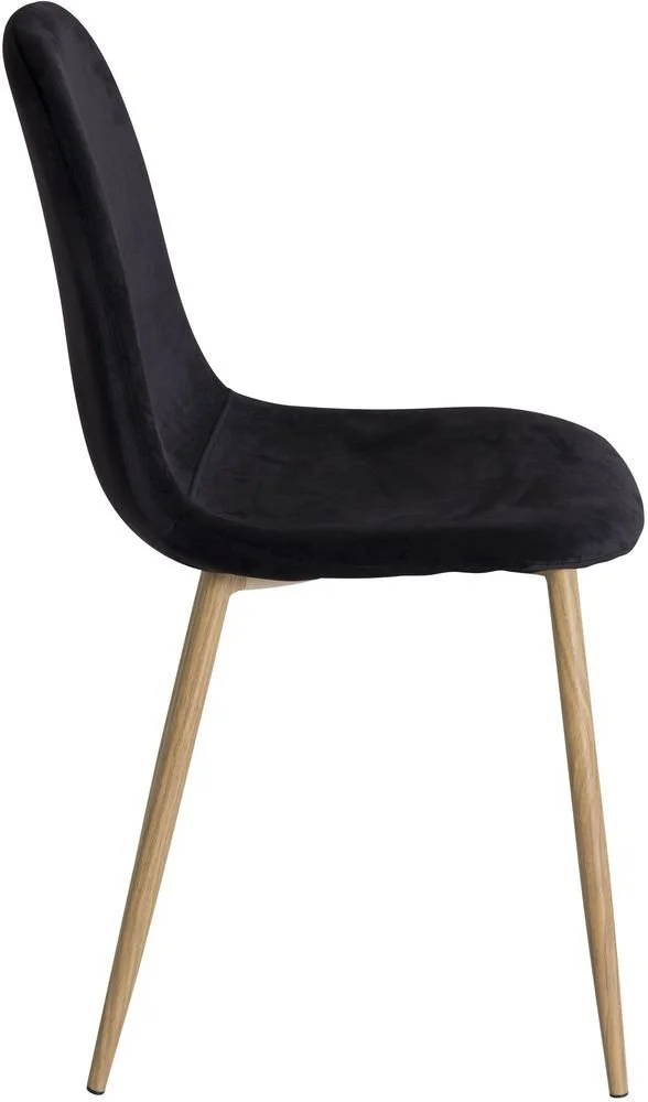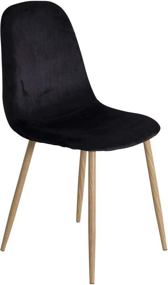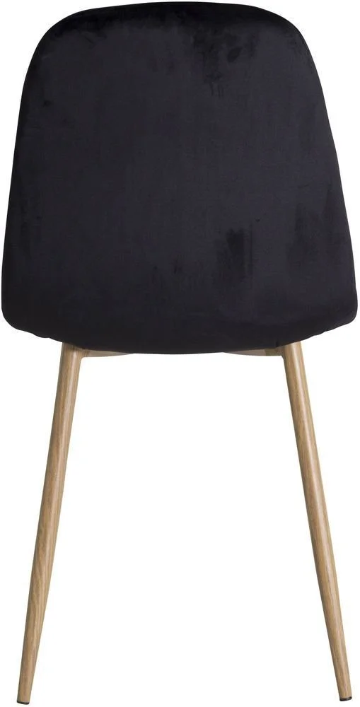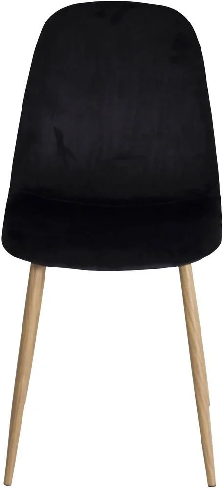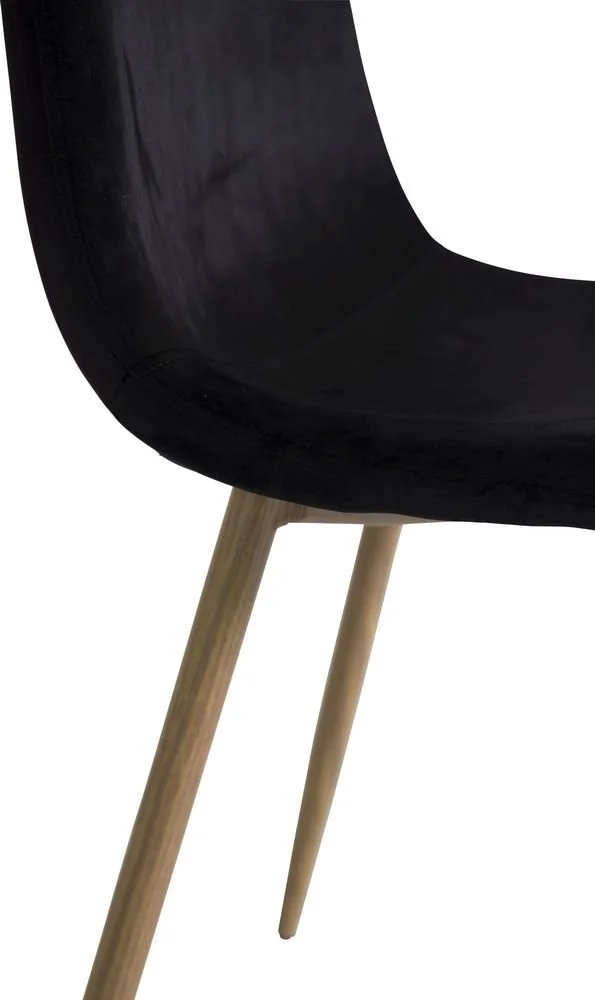 Stol klädd i svart sammet, 100% polyester. Sits- och rygg är skumstoppade. Ben av metall med mönster av ek.