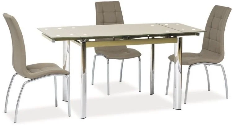 Ett fint matbord med en modern design. Underredet är tillverkat av kromad metall och bordsskivan är av härdat glas. Bordet är praktiskt då du lätt kan förlänga det från 100 cm till 150 cm. Tilläggsskiva ingår.