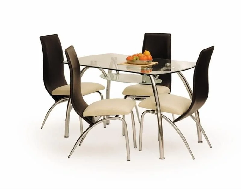 Ett härligt matbord med en modern design. Bordsskivan är tillverkad i klarglas med en praktisk underhylla i frostat glas för smart förvaring, och underredet är av kromad metall.