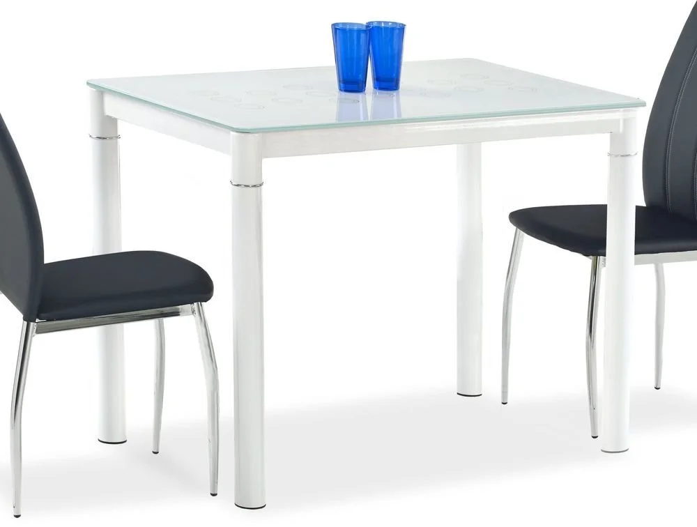 Ett stilrent matbord med en klassisk design. Underredet är tillverkat i vit metall med detaljer i krom, och bordsskivan är av vitt glas.