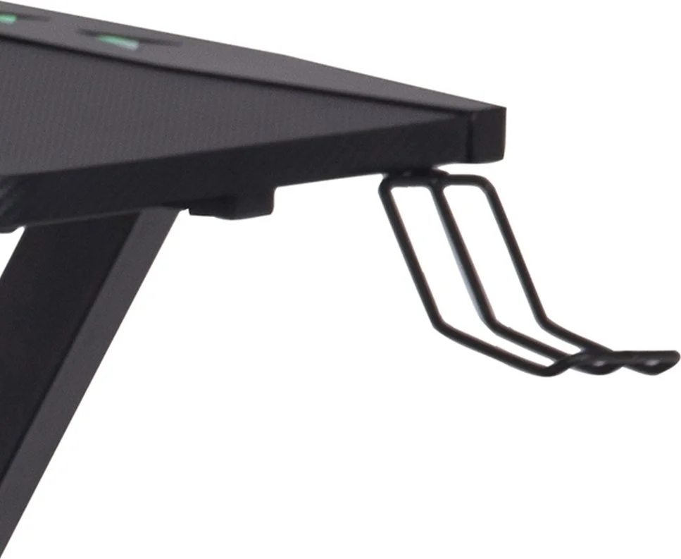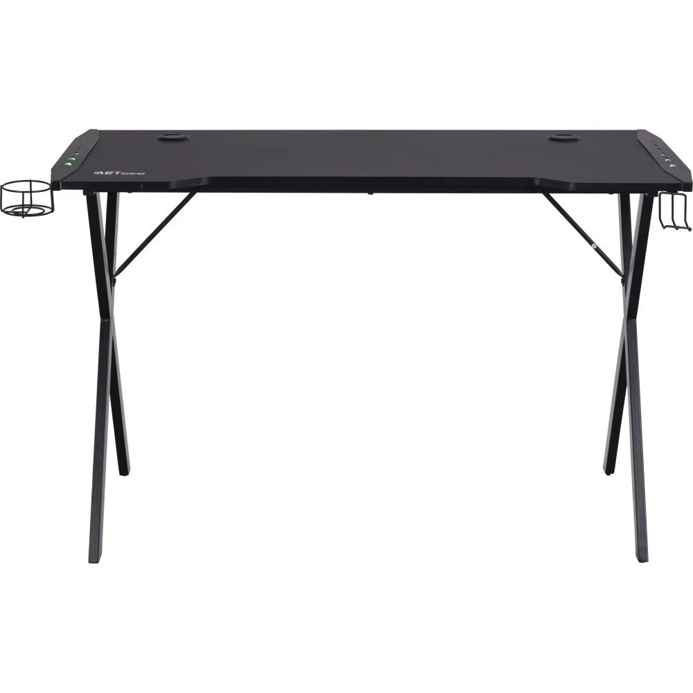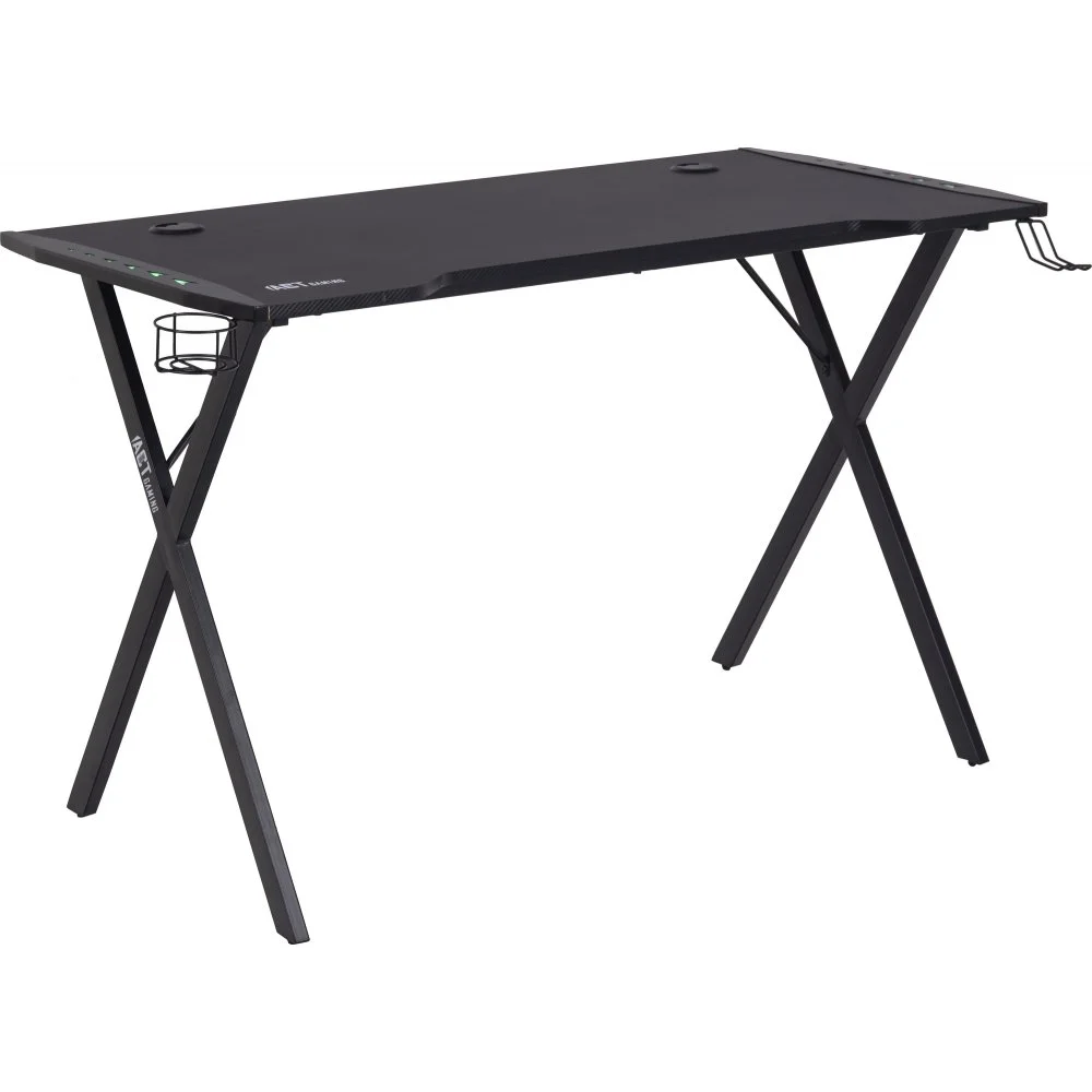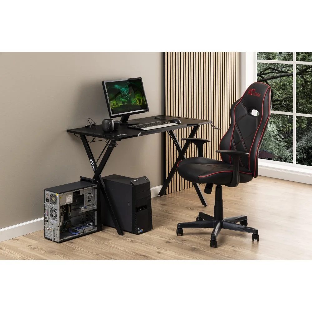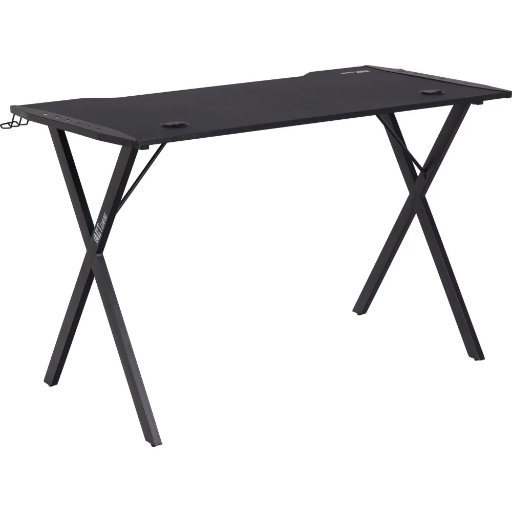 Skrivbord med ben av pulverlackerad metall. Bordsskiva av melamin och MDF.