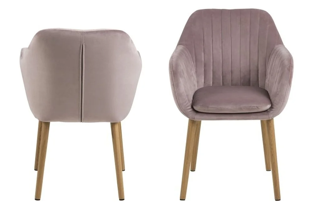 Karmstol med en klassisk profil. Klädd i rosa sammetstyg och med ben gjorda på oljebehandlad ek. Stolen ingår i vår Emilia serie.