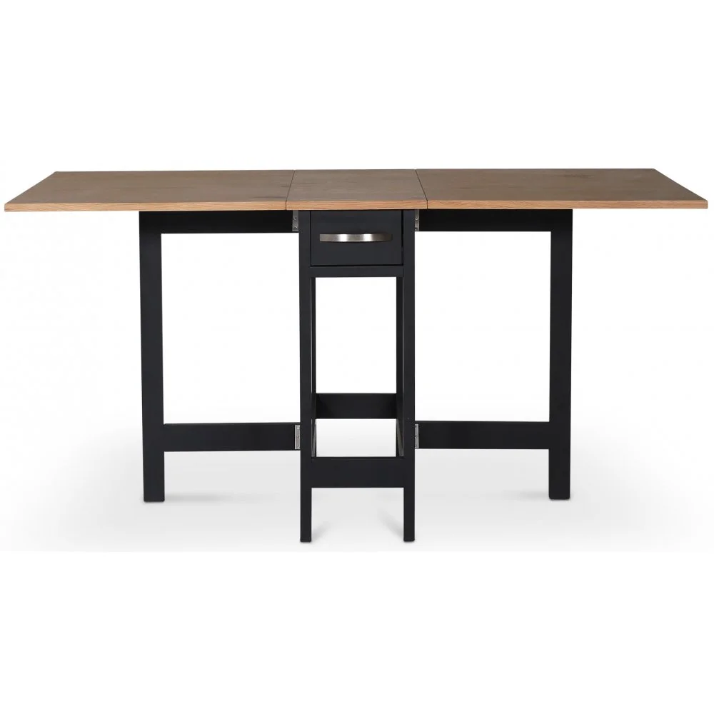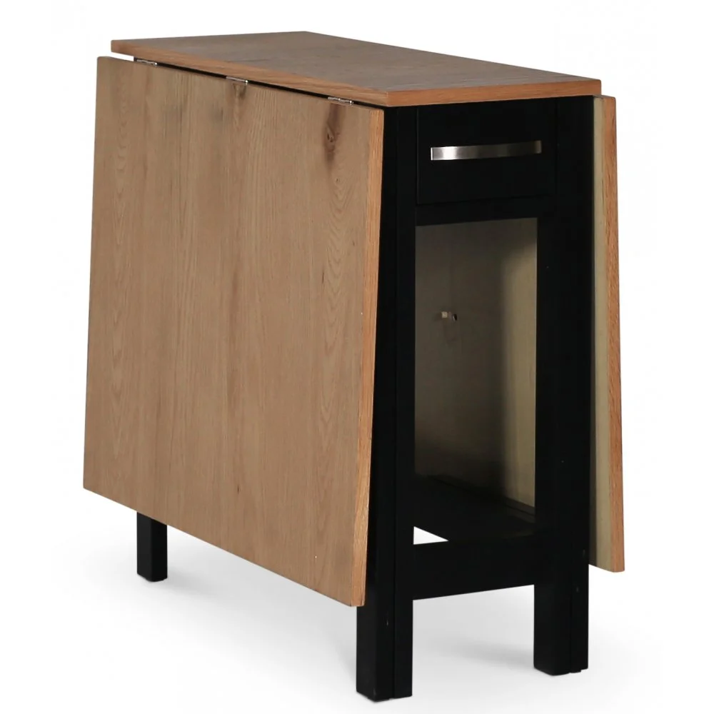 Fårö slagbord med svart underrede och toppskiva av ekfanér. Tillverkat av akacia, fanér och MDF. Ett stilrent och praktiskt bord, som även har två utdragbara lådor (en på varje sida av bordet). Ett slagbord får plats i den minsta vrå i nedfällt läge medans ett fullt uppfällt slagbord rymmer hela familjen runt bordet.