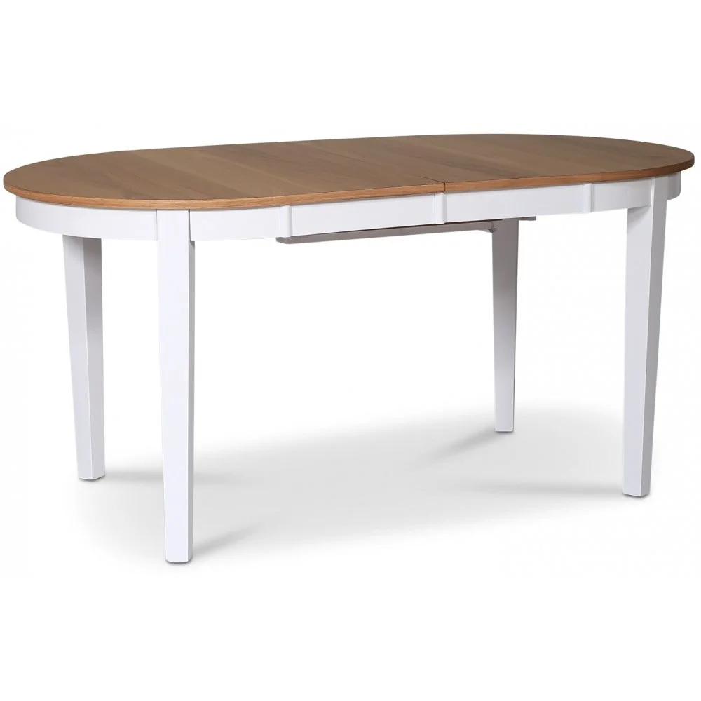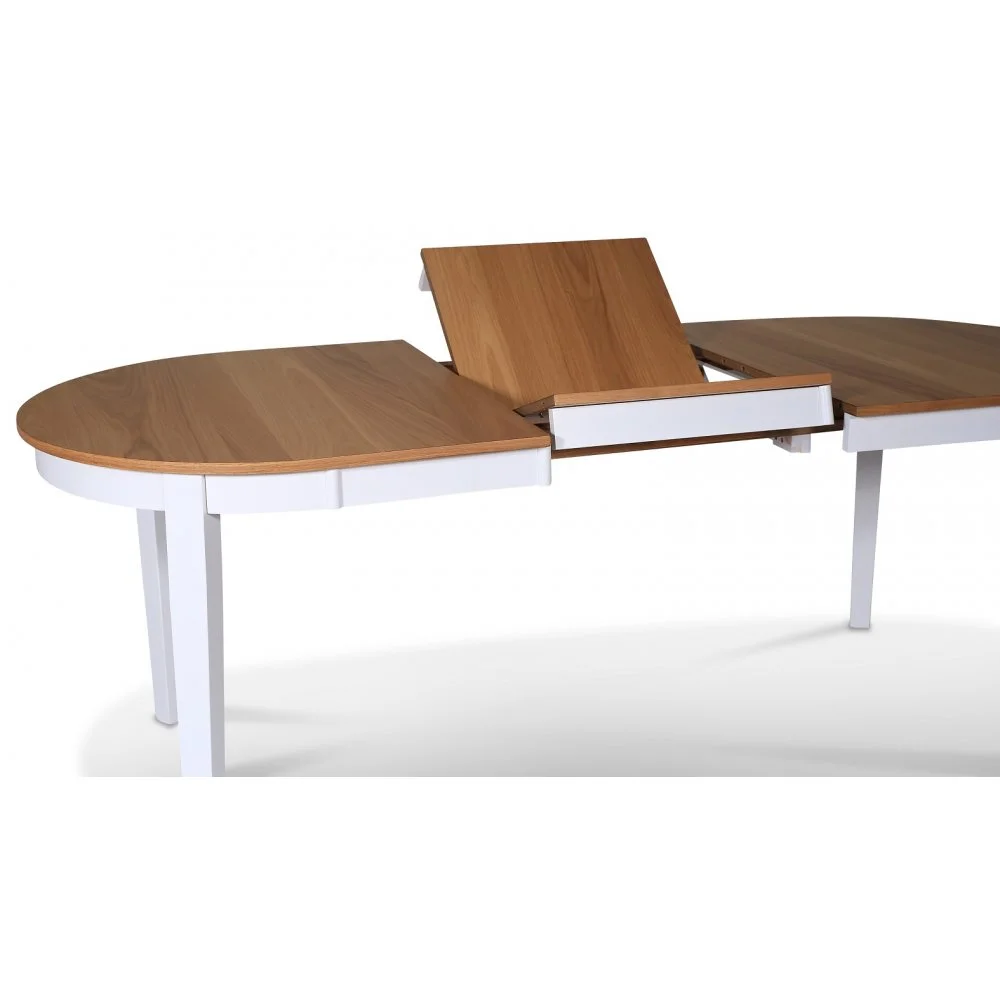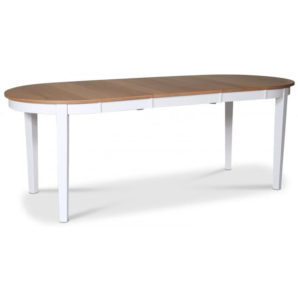 Våra matrums serier Fårö, Skagen och Dalarö är utformade i klassisk design där stilren design möter kvalitet. Detta ovala bord förlängs med hjälp av den inbyggda ”butterfly” skivan som enkelt väcklas upp ur bordets mitt och ger mer yta för familjen och gästerna. Underrede i vitlackat massivt trä med en toppskiva av matt exklusiv oljad ek-fanèr.