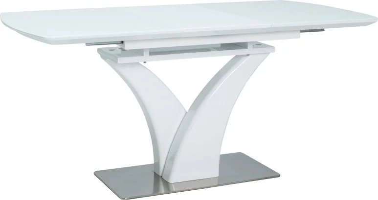 Förlängningsbart matbord i trä, metall och tempererat glas.