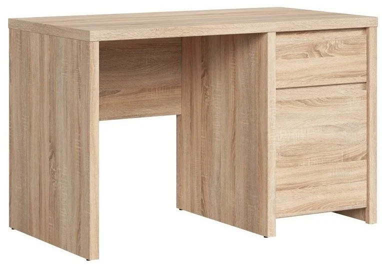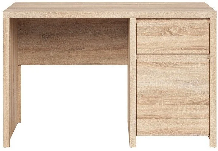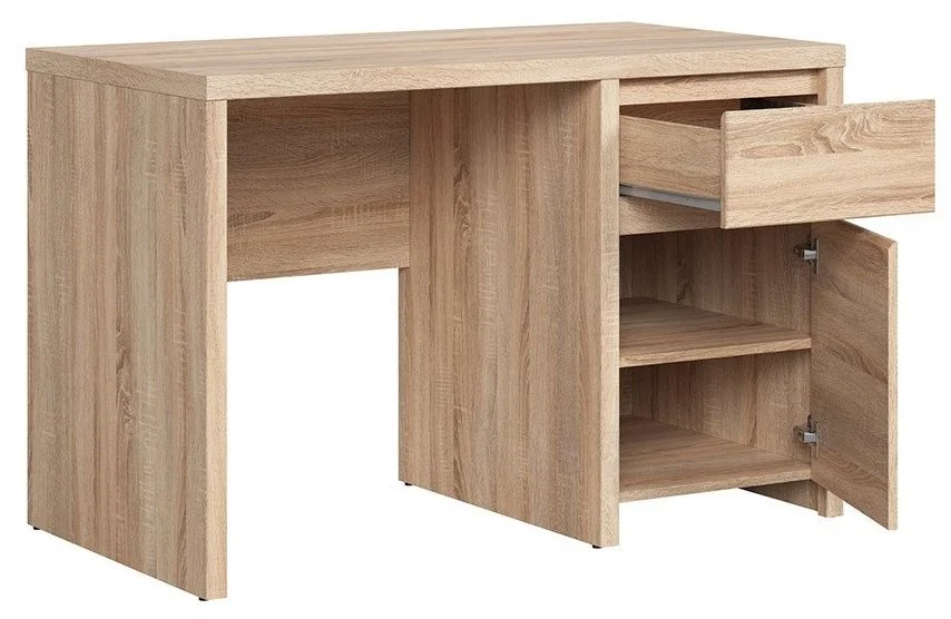 Ett snyggt skrivbord tillverkat i MDF med ljus ek utförande och med ett skåp och en låda med integrerade handtag. En vågrät skiva undertill skyddar väggen mot smuts men stabiliserar även skrivbordet. Den utdragbara tangentbordshyllan frigör utrymme uppe på skrivbordet.