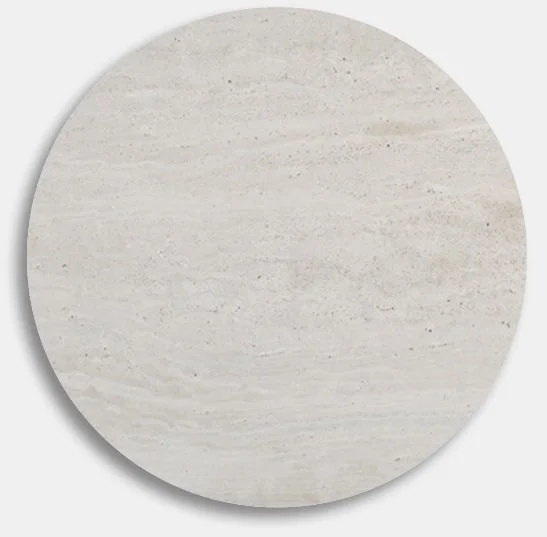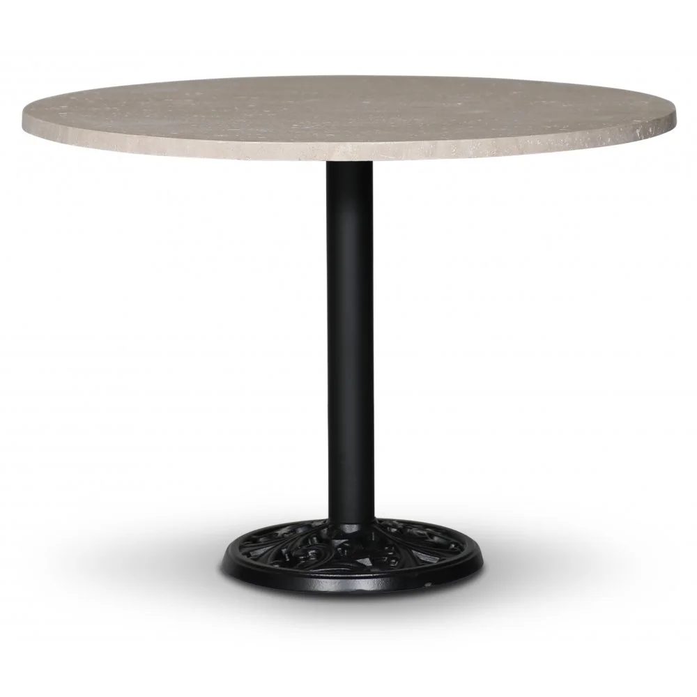 Flair matbord och soffbord är naturligt vackra då toppskivan alltid är av en sten. Denna modellen har en snygg runt toppskiva i äkta Travertin kalksten. Alla travertin stenar är unika med dess mönster och håligheter för att ge den naturliga känslan. Bordsfoten är av svartlackad gjuten metall för att ge stabilitet.