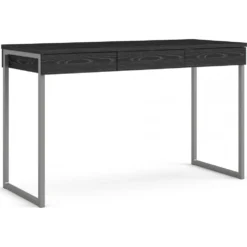 Skrivbord av trä med kantband av melamin och ABS-plast. Ben av stål.