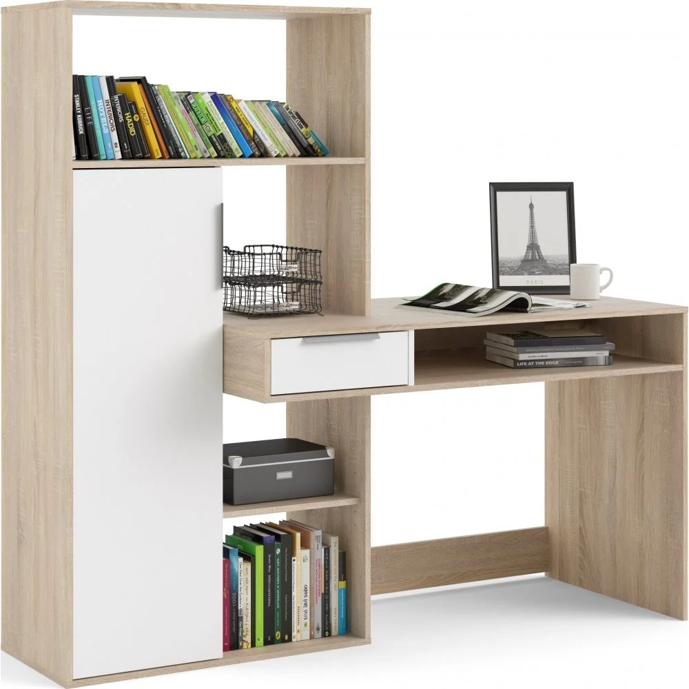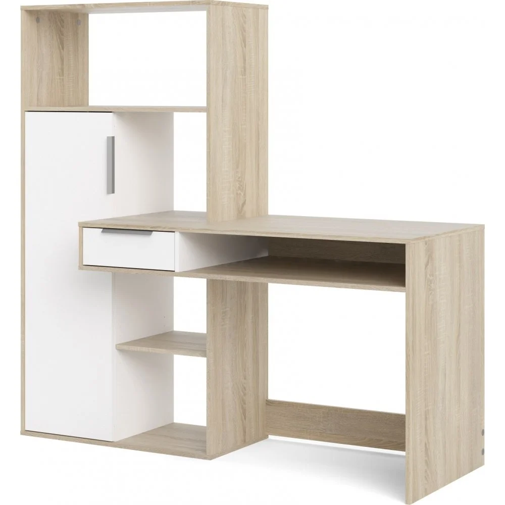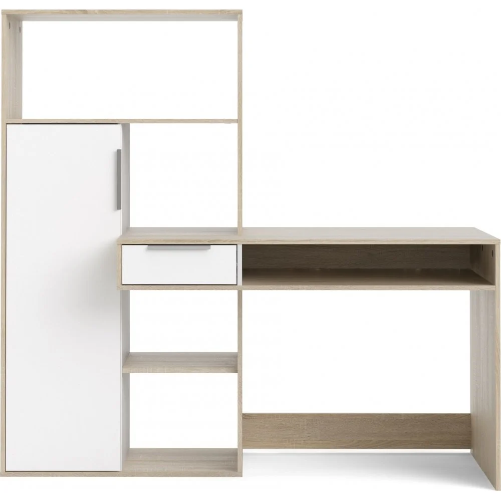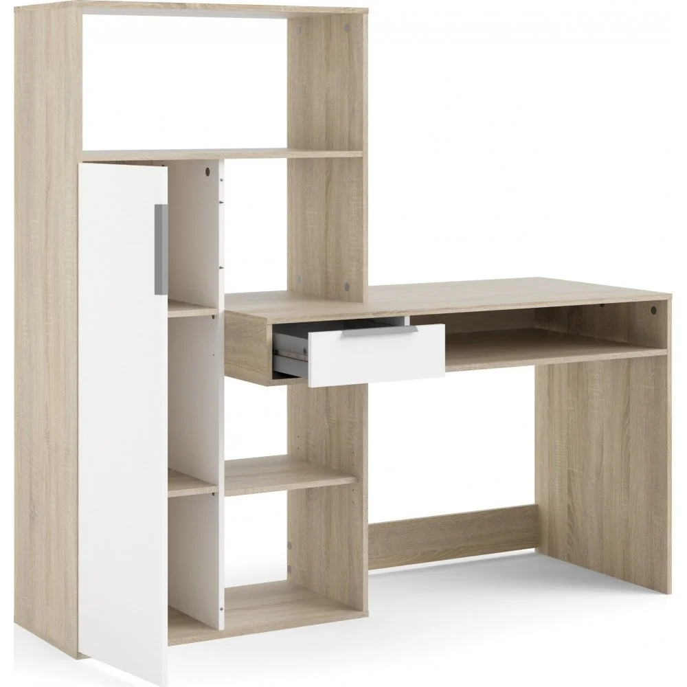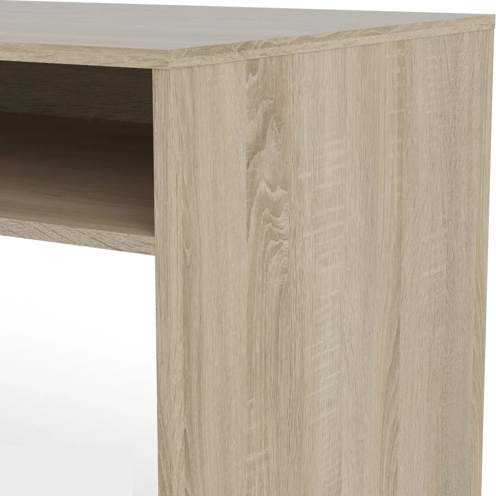 Skrivbord av trä med kantband av melamin och ABS-plast. Ben av plast och handtag av stål.