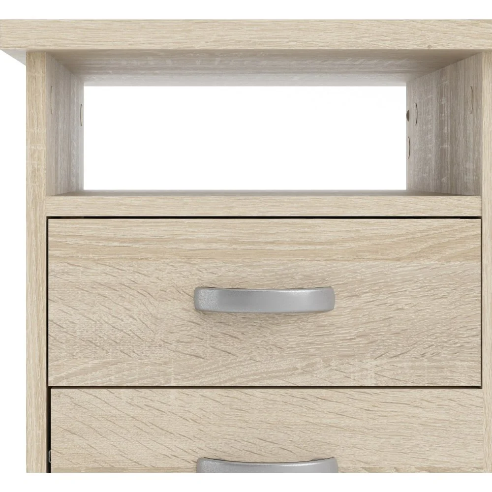 Skrivbord av trä med kantband av melamin. Handtag av metall och ben av plast.