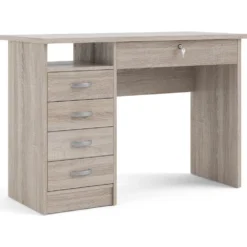 Skrivbord av trä med kantband av melamin. Handtag av metall och ben av plast.