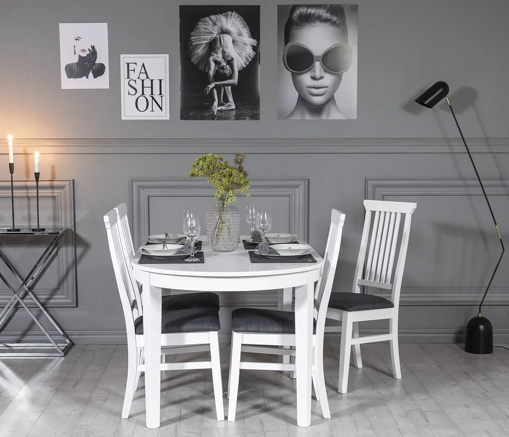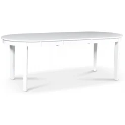 Rymligt matbord med underrede av vitt massivt heveaträ och bordsskiva av vit MDF. Bordet har en inbyggd butterflyskiva som smidigt förlänger bordet från 160 cm till 210 cm.
