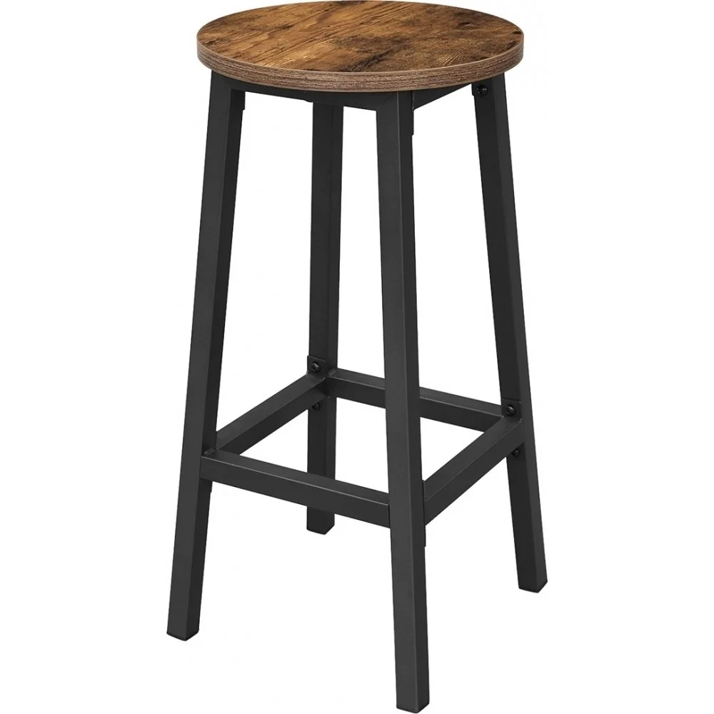 2 st rustika barstolar med ben av svart stål och sits av trä.
