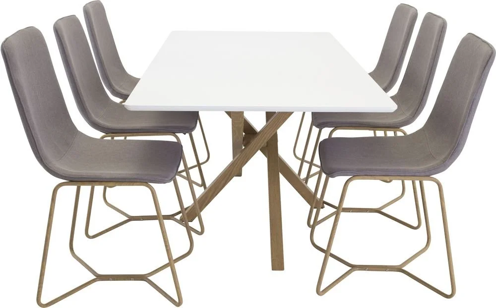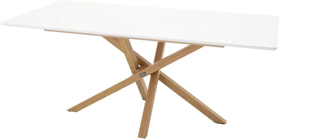 Matbord med bordsskiva av vit MDF och underrede i ek.