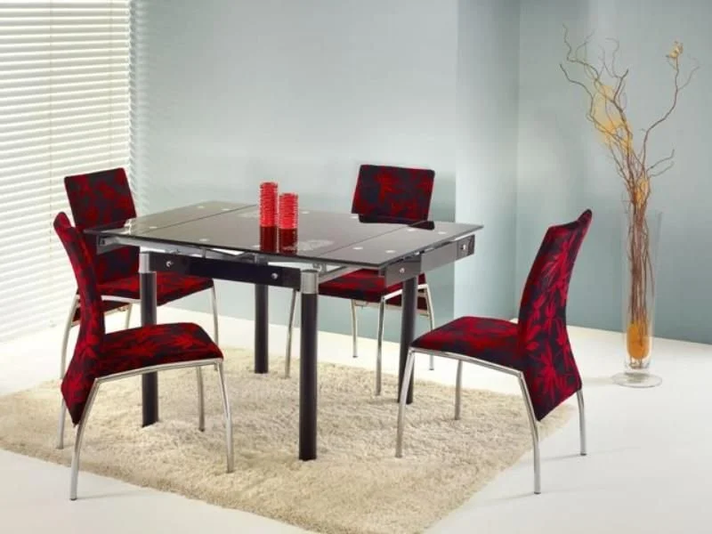 Ett härligt matbord med en modern design. Underredet är tillverkat i svartlackerad metall med detaljer i krom. Bordsskivan är av mycket vackert svart glas. Bordsskivan är även utdragbar och kan ge en längd från 80 cm till 130 cm.