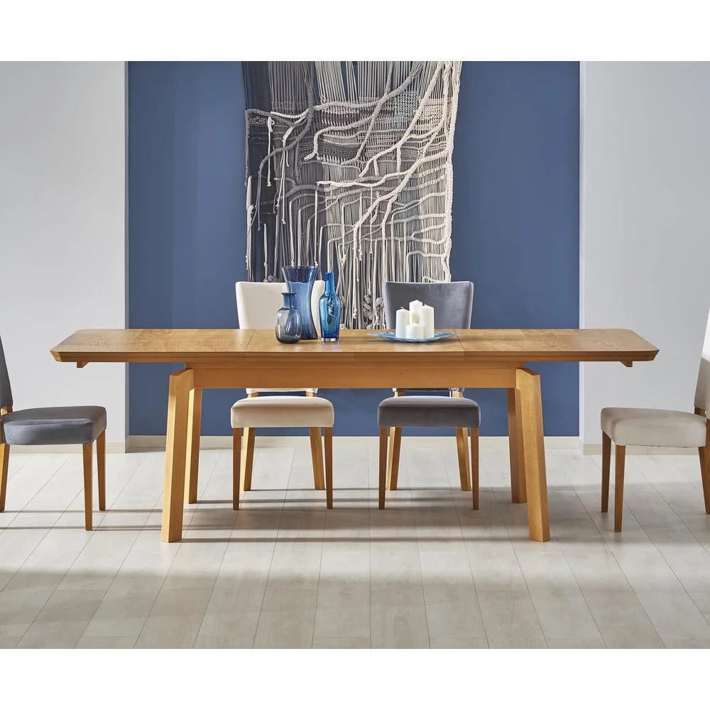 Ett snyggt och rymligt matbord med en stilren design. Bordsskivan är tillverkad i MFP (premium träskiva) med ett vackert fanér och underredet är av solid trä. Bordet är utdragbart upp till 250 cm, tilläggsskivor ingår.