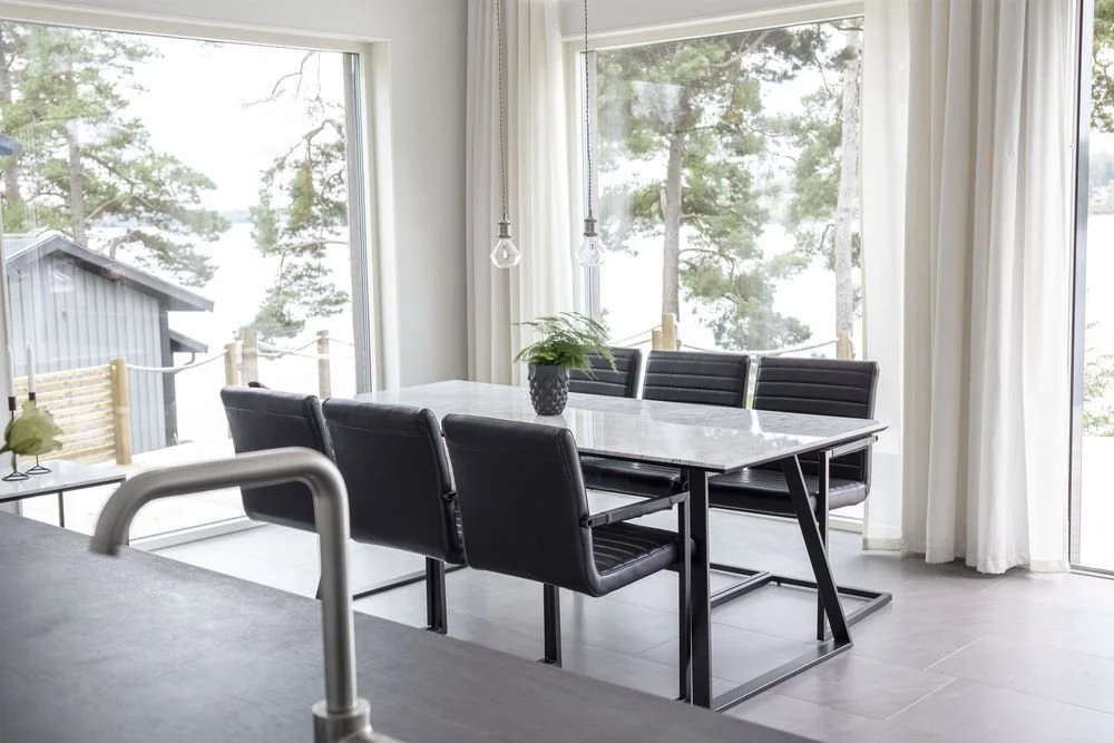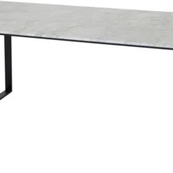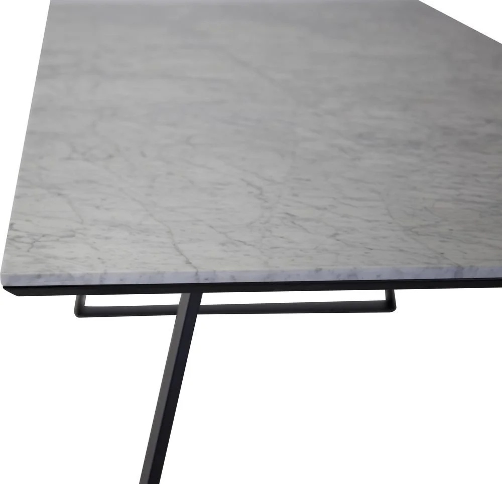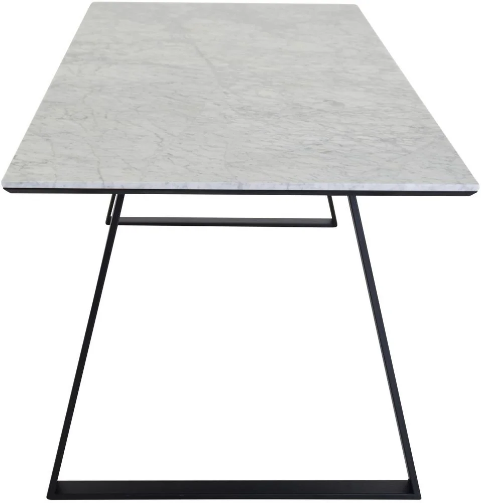 Stort och stilfullt matbord med bordsskiva i vit marmor och underrede i svart metall. Finns även med bordsskiva i svart marmor. Marmor är en natursten och ingen bordsskiva är den andra lik. Skiftningar kan förekomma vad gäller färg, mönstring och struktur mellan olika stenblock.