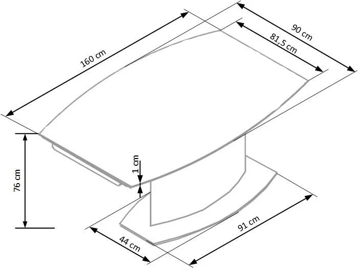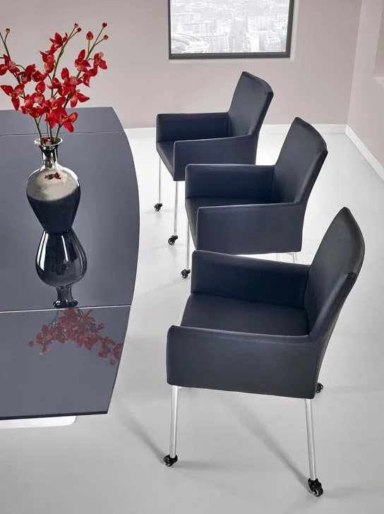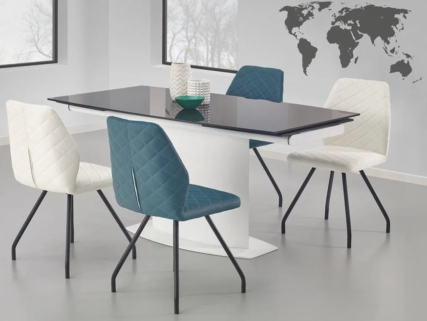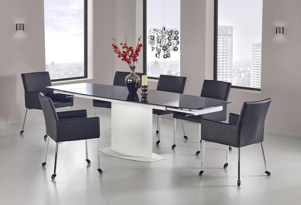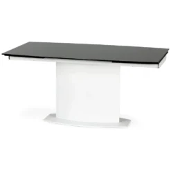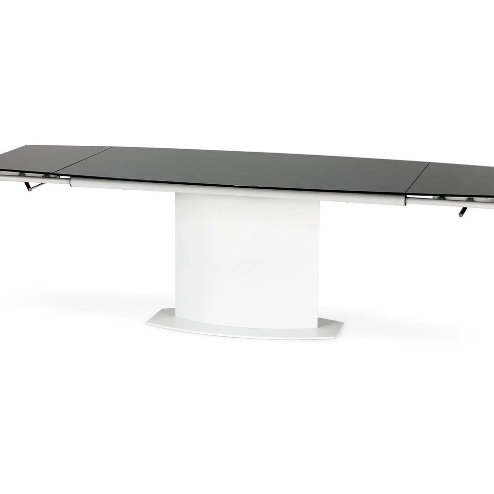 Ett elegant matbord med en modern design. Underredet är tillverkat i vitlackerad metall och MFP (premium träskiva), och bordsskivan är av mycket tåligt och vackert svart glas. Bordet är praktiskt då det kan lätt förlängas från 160 cm till 250 cm, perfekt när man har ett större sällskap.