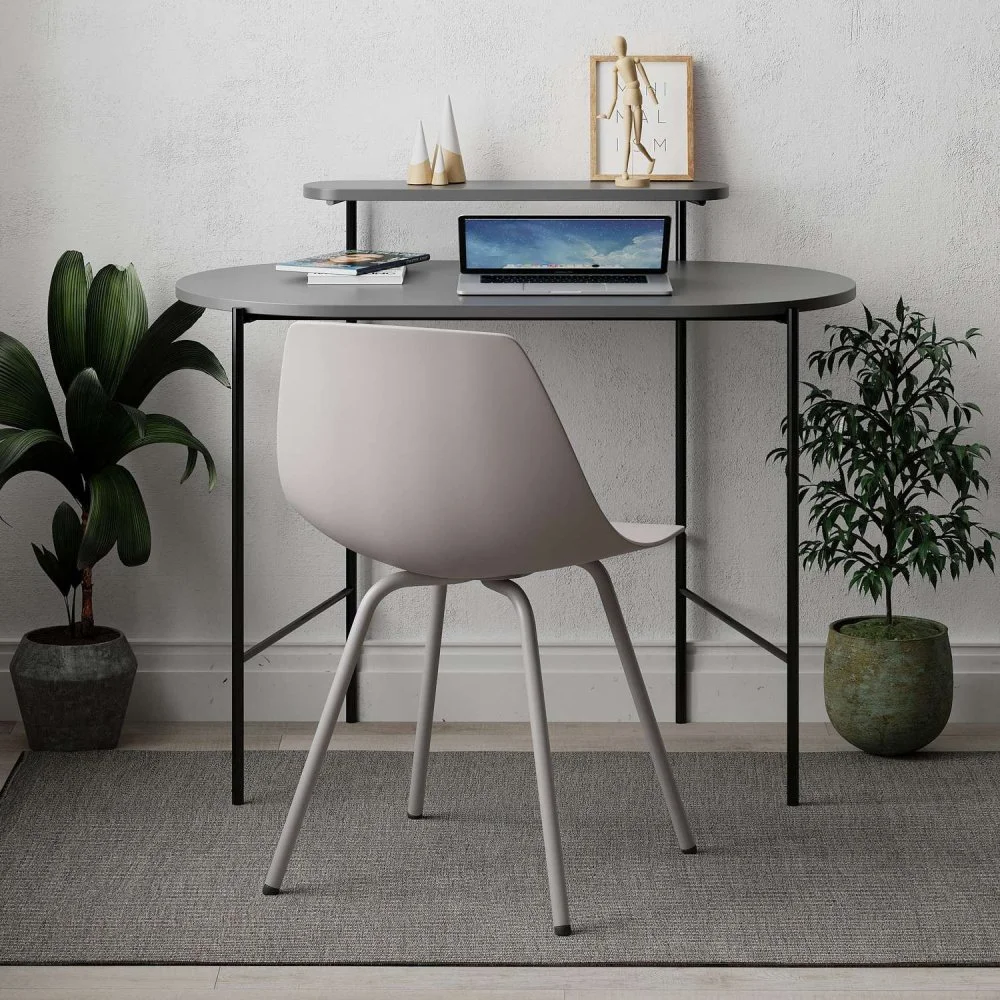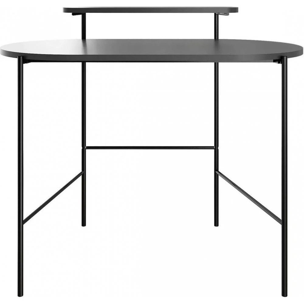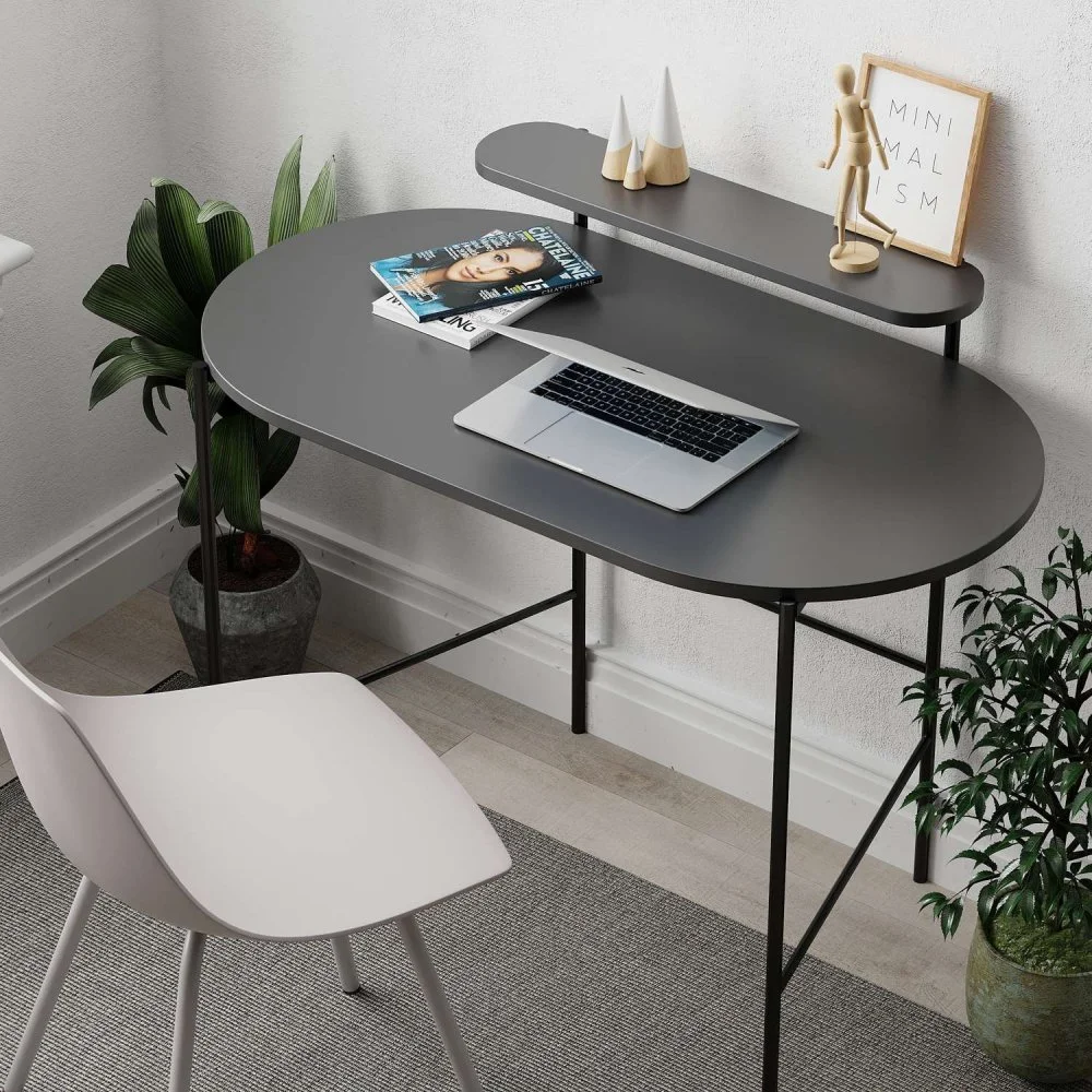 Skrivbord av trä och metall.