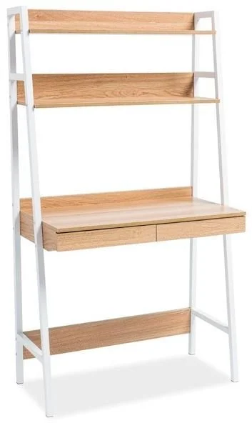 En härlig skrivbordshylla med en modern design. Stommen är tillverkad av vit metall och hyllplanen är av MDF med ett härligt ek utförande. rustad med ett större hyllplan med två lådor som kan användas som skrivbord och två mindre hyllor för exempelvis dekorationer eller prydnader.