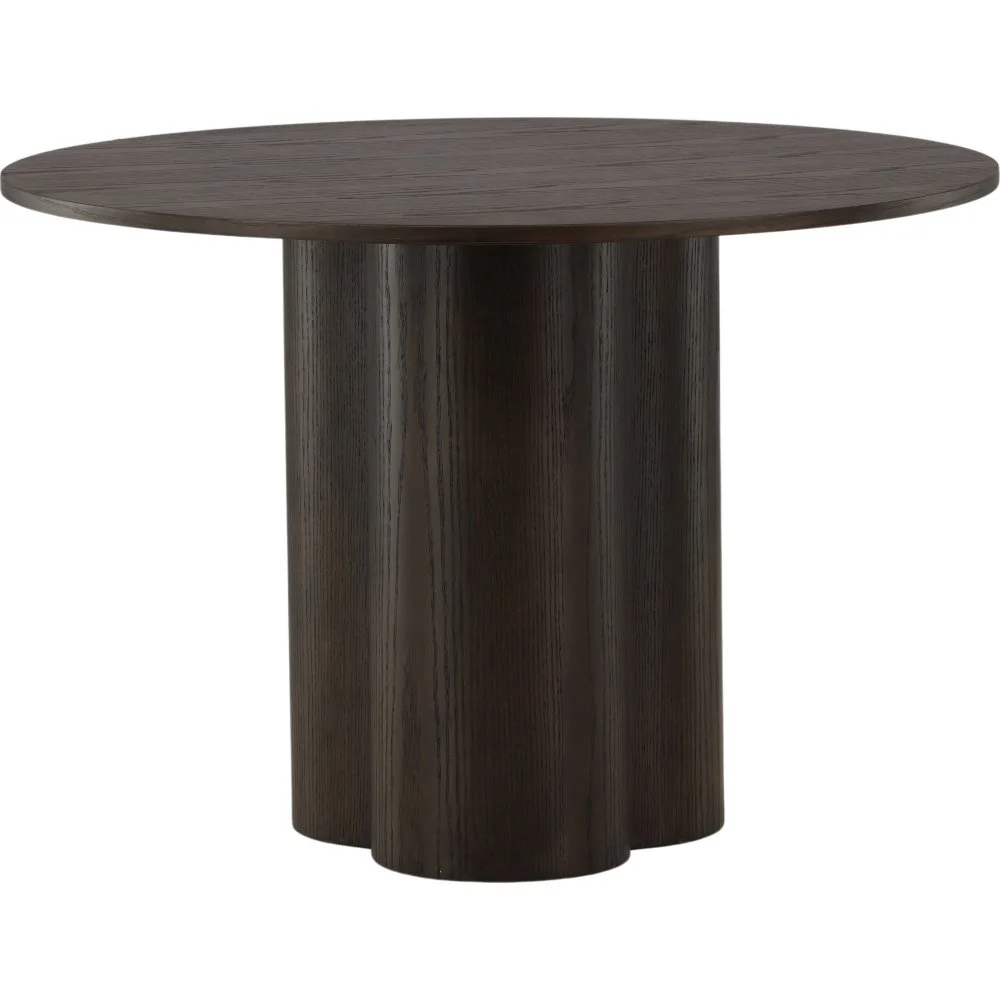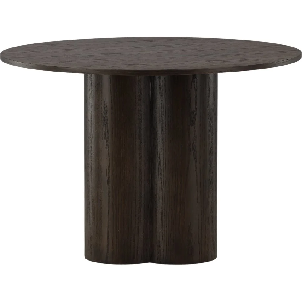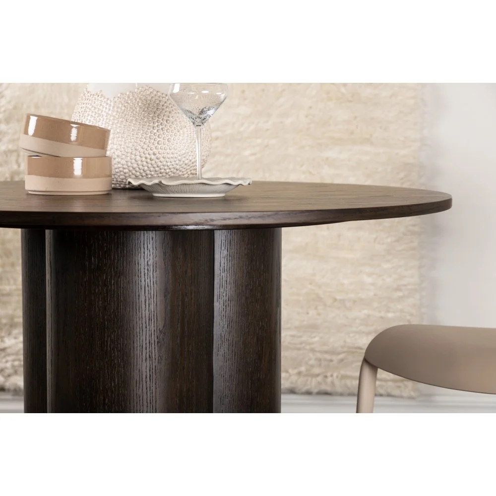 Matbord som imponerar med sin skandinaviska design och smakfulla utformning. Bordet har en genomgående helhetsdesign i mockafärgad MDF med en tunn, rund toppskiva och tre cylinderformade ben som sitter samlat under bordets mitt. Det tunna färglagret synliggör materialets mönster och ger liv och rörelse till bordet.