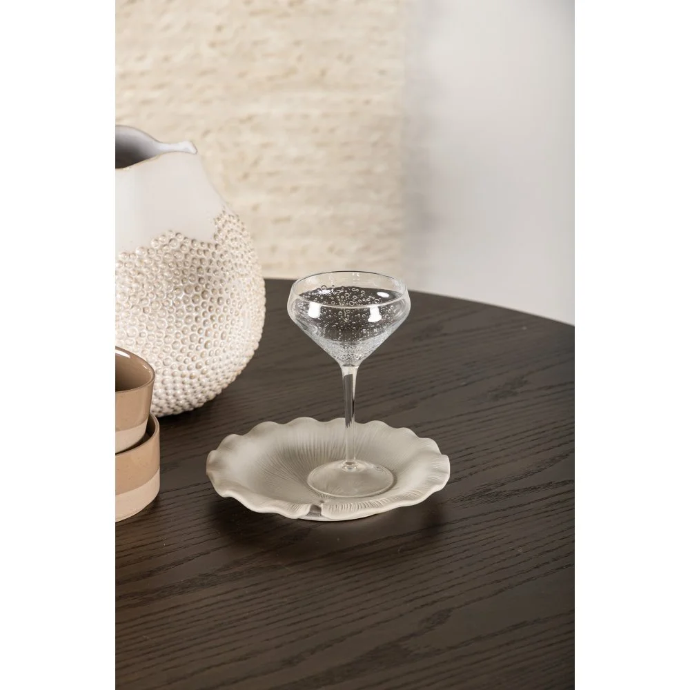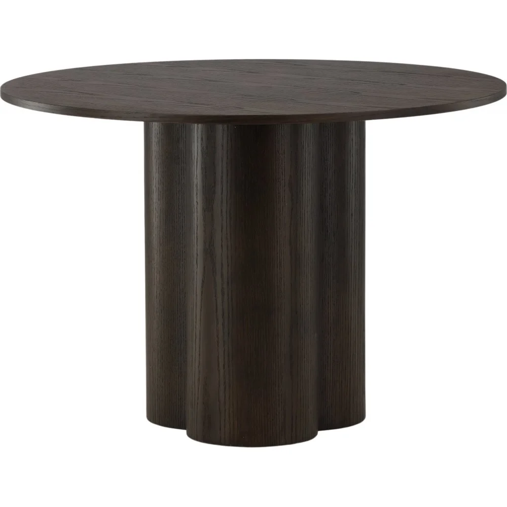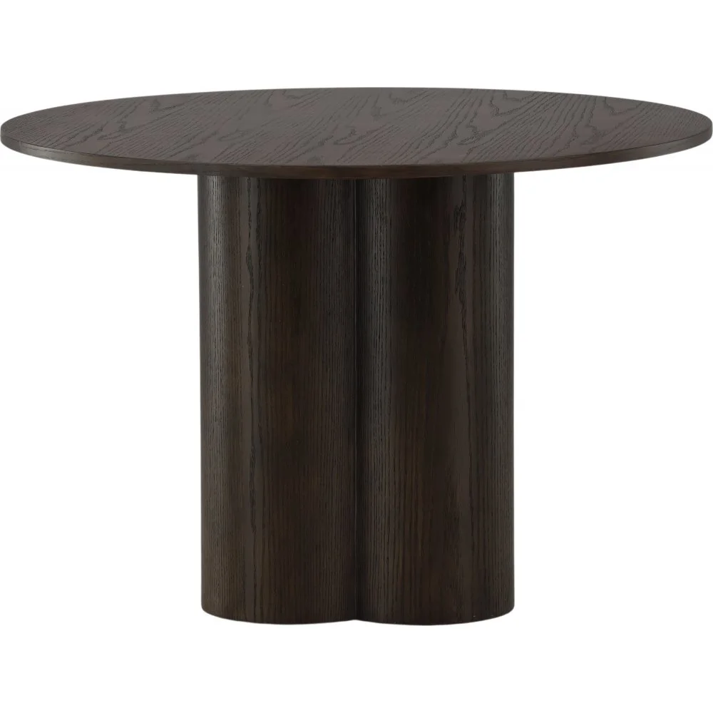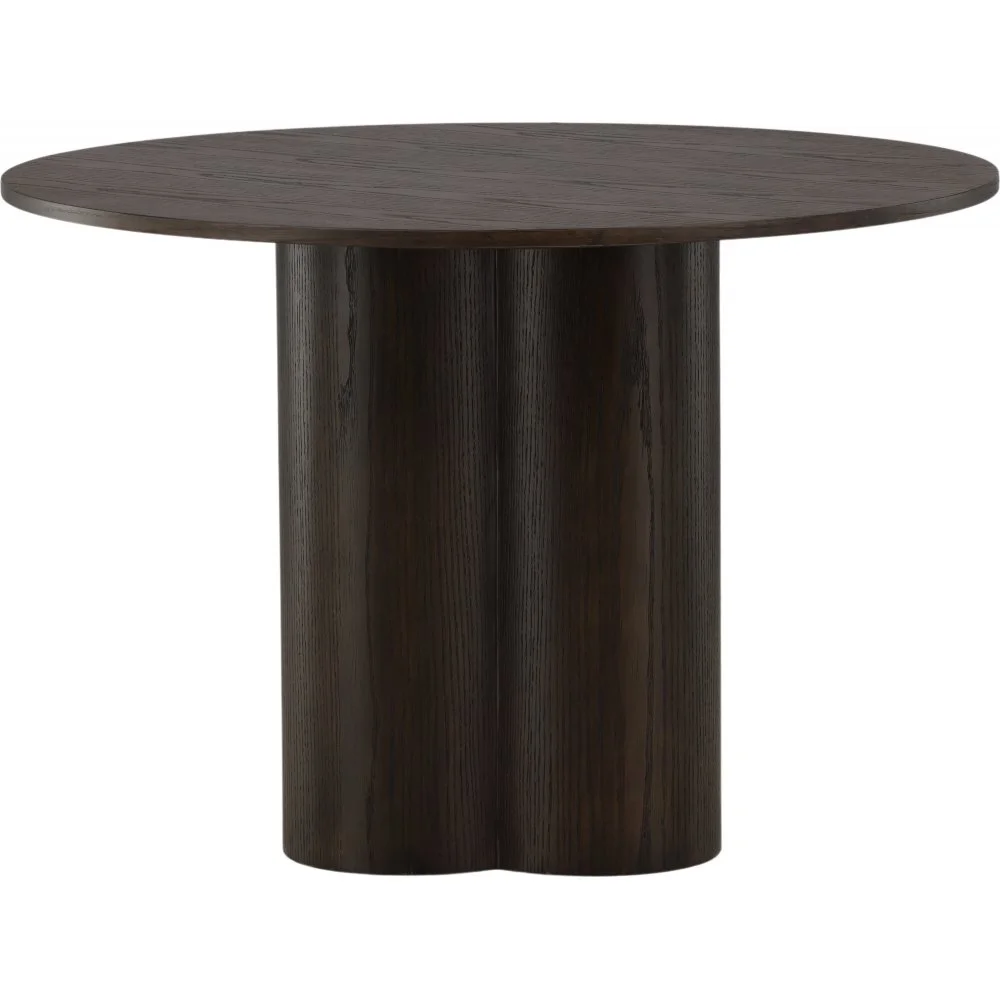Matbord som imponerar med sin skandinaviska design och smakfulla utformning. Bordet har en genomgående helhetsdesign i mockafärgad MDF med en tunn, rund toppskiva och tre cylinderformade ben som sitter samlat under bordets mitt. Det tunna färglagret synliggör materialets mönster och ger liv och rörelse till bordet.