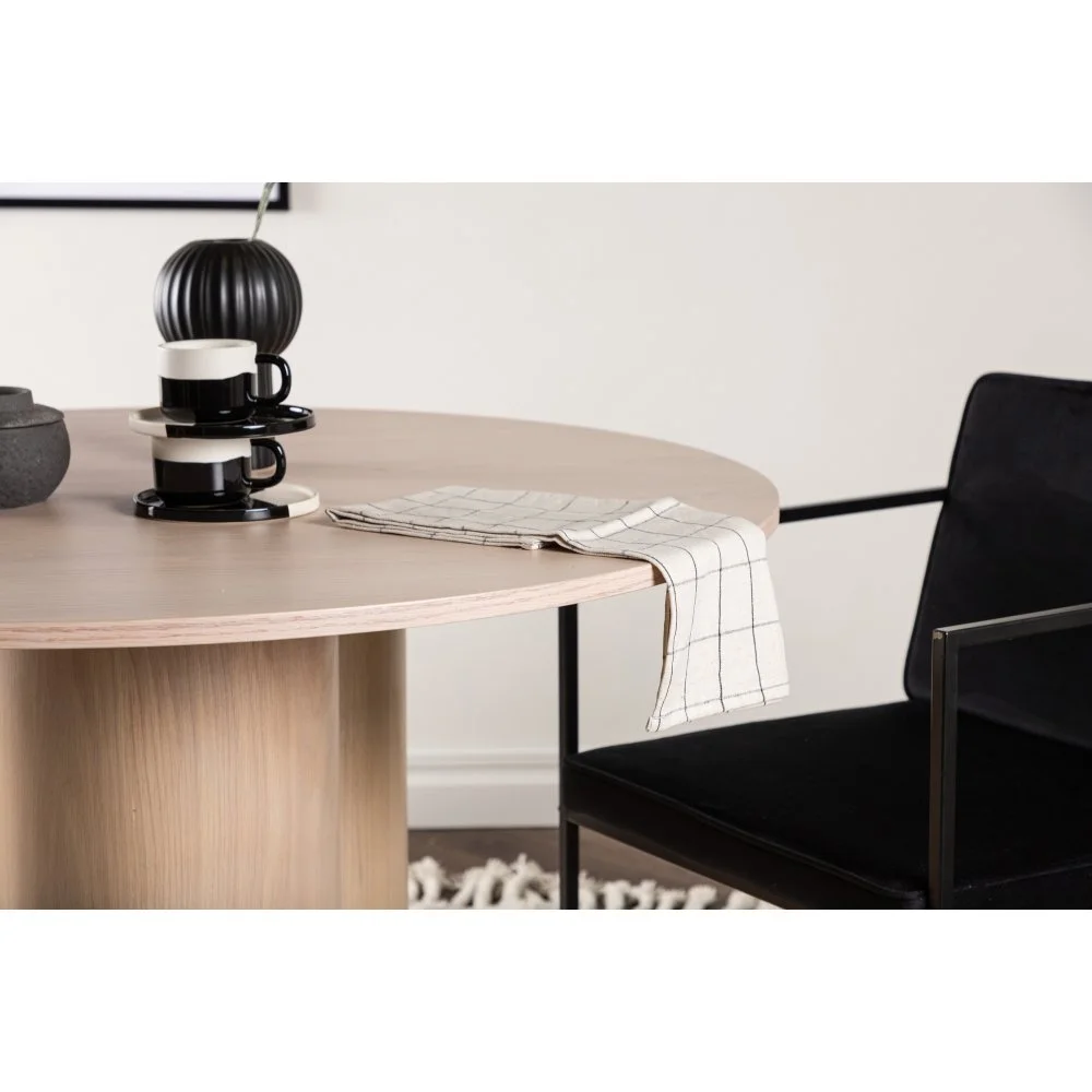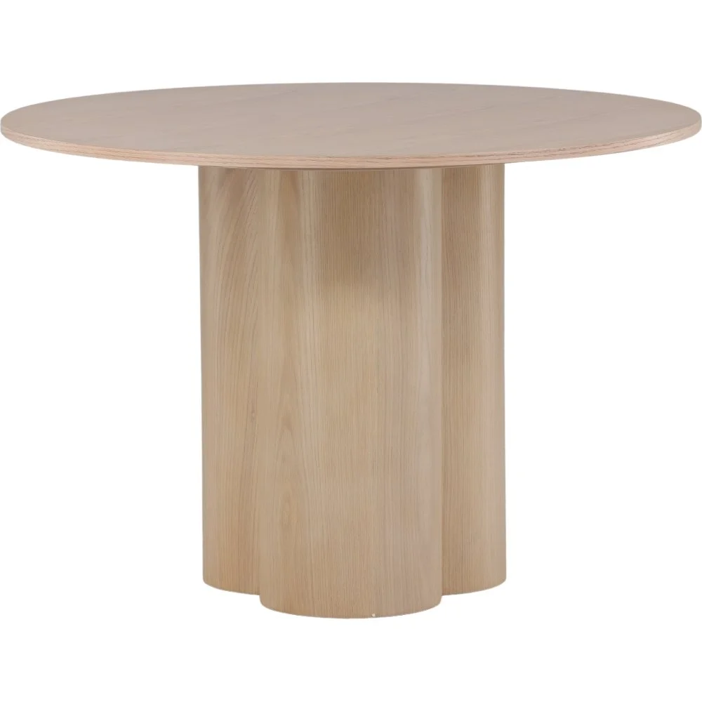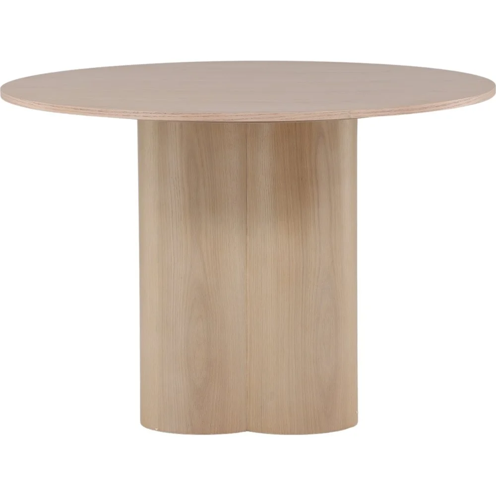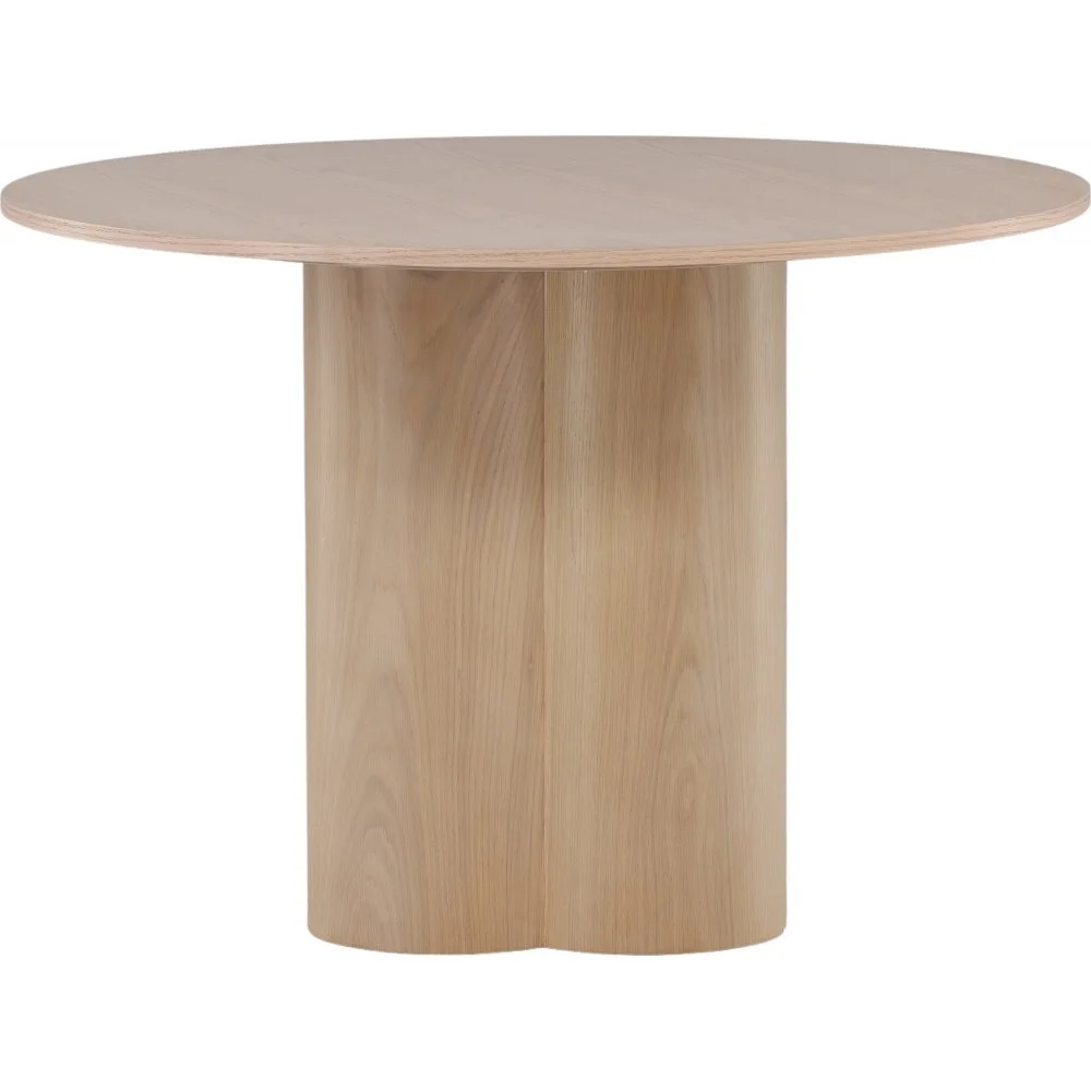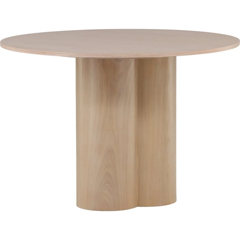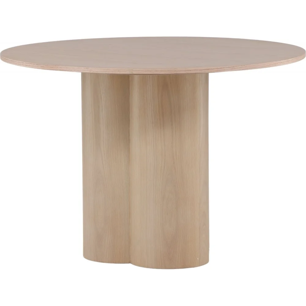 Matbord med skandinavisk design och smakfull utformning. Bordet har en genomgående helhetsdesign i vitputsad MDF med en tunn, rund toppskiva och tre cylinderformade ben som sitter samlat under bordets mitt. Det tunna färglagret synliggör materialets mönster och ger liv och rörelse till bordet. Skapa ett stilrent blickfång i hemmets hjärta där hamnar ingen på kanten.