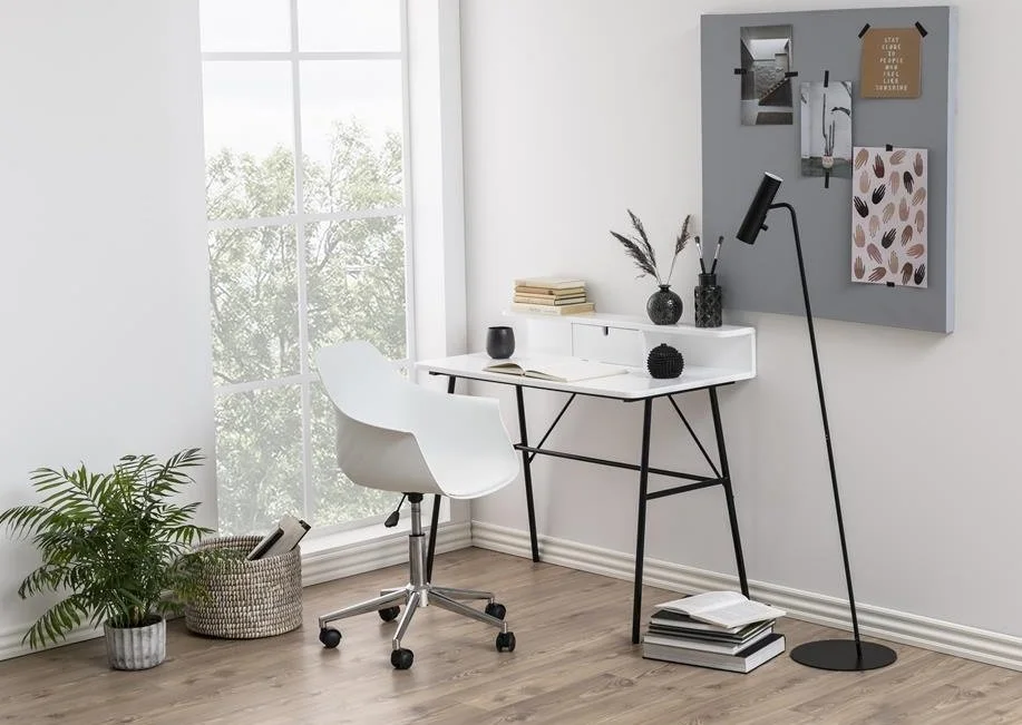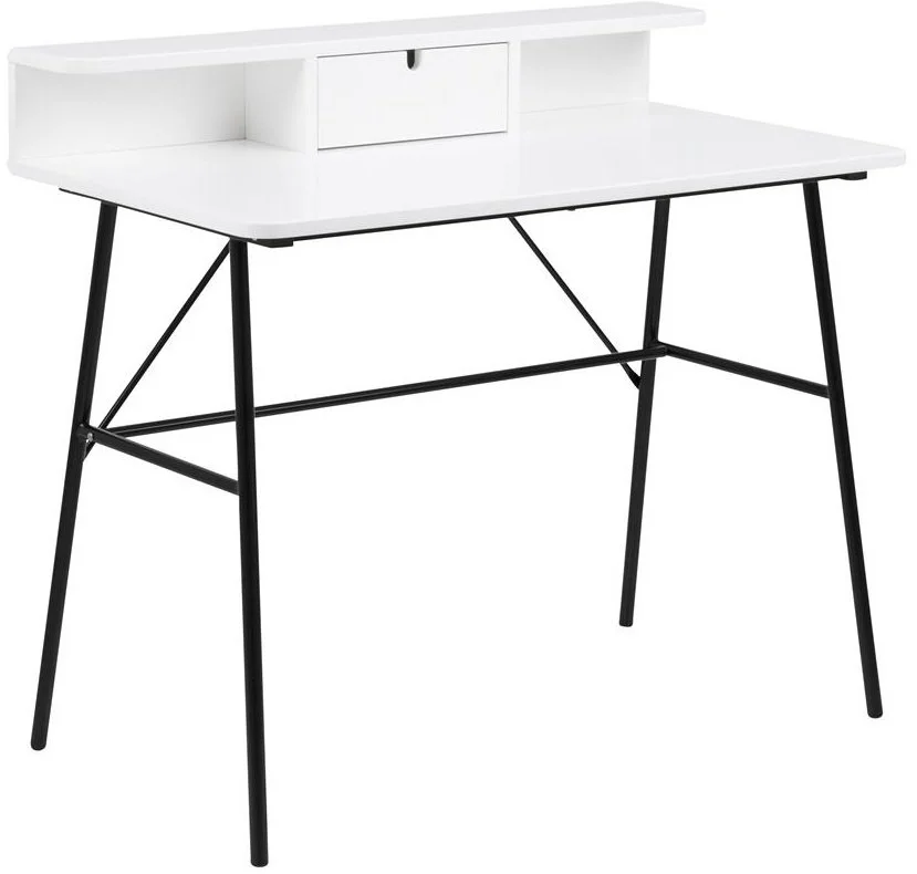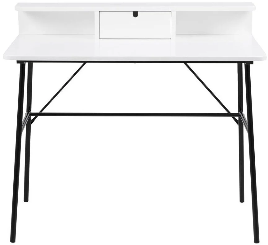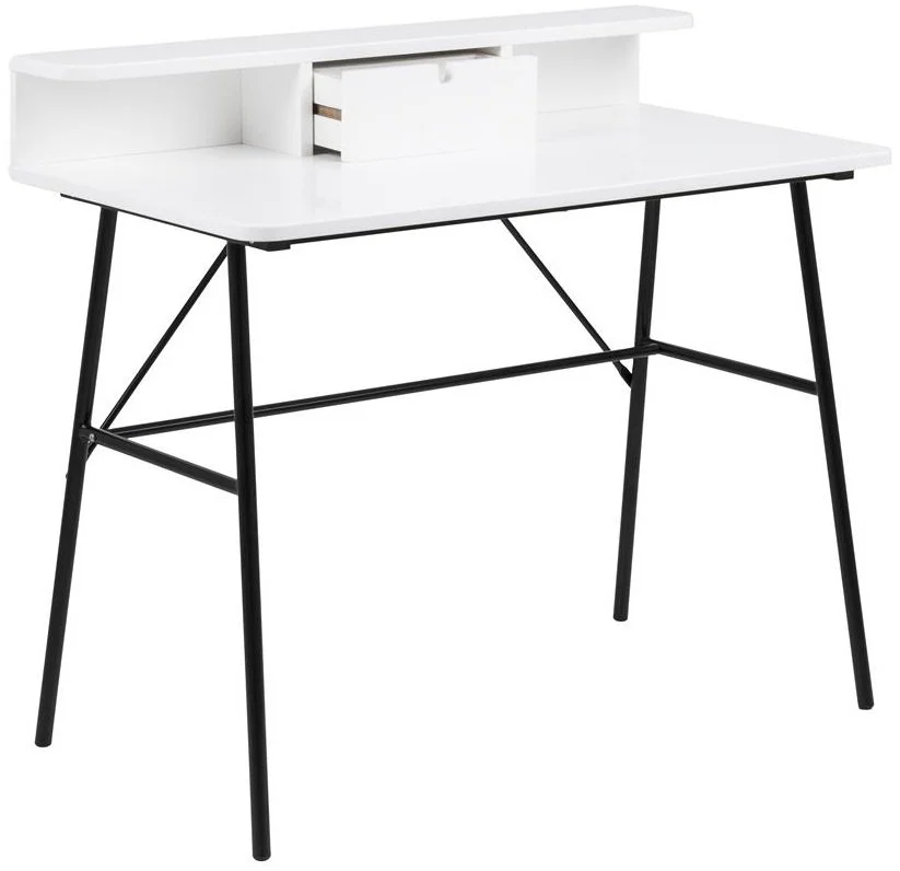 Modernt designat skrivbord. Lätt med mycket yta för arbeten. Bordsskivan är vitmålad och lackad med benen är av svart pulverlackerad metall.