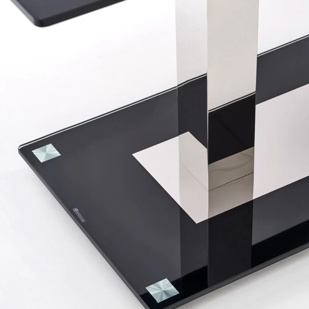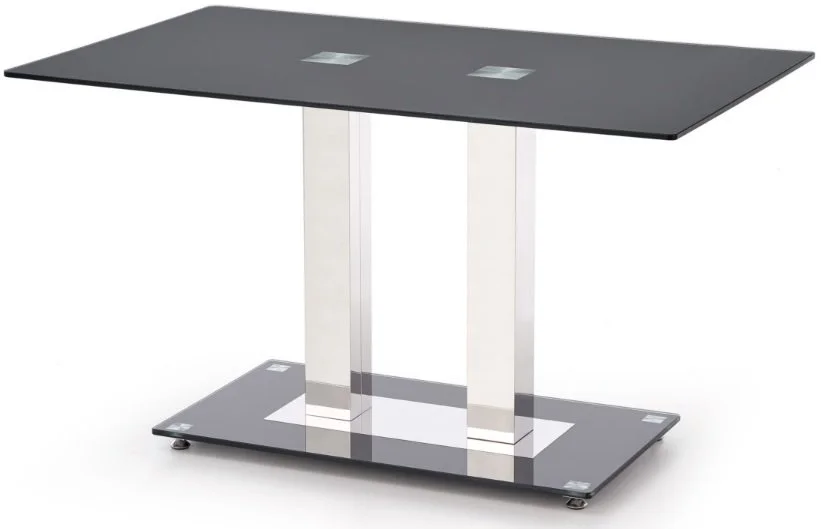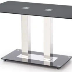 Snyggt matbord med en modern design. Underredet är tillverkat i kromad metall och foten är i svart glas. Även toppskivan är i vackert svart glas.
