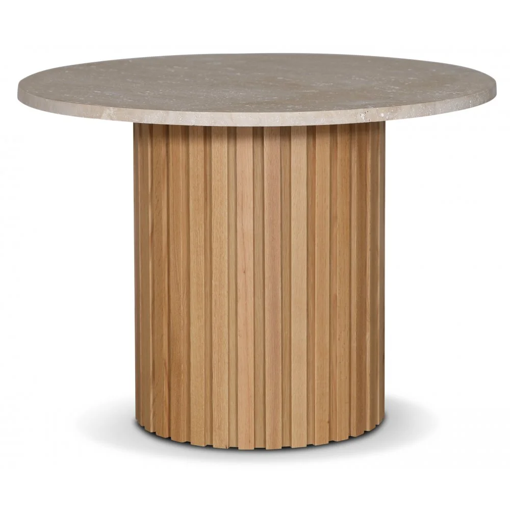 Vår PiPi bordsserie står för hantverk, design och hållbarhet. Vi erbjuder valnöt, whitewash, svartbetsat trä och ek. Serien innehåller olika storlekar och utföranden. Välj just ditt utförande för matplatsen. Denna modellen har en snygg rund toppskiva i äkta travertin kalksten. Alla travertin stenar är unika med dess mönster och håligheter för att ge den naturliga känslan.