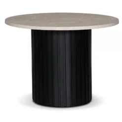 Vår PiPi bordsserie står för hantverk, design och hållbarhet. Vi erbjuder valnöt, whitewash, svartbetsat trä och ek. Serien innehåller olika storlekar och utföranden. Välj just ditt utförande för matplatsen. Denna modellen har en snygg runt toppskiva i äkta kalksten, Travertin. Alla travertin stenar är unika med dess mönster och håligheter för att ge den naturliga känslan.