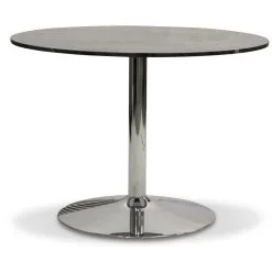 Ett runt matbord i stilren och modern design med toppskiva i äkta grå marmorsten. Trumpetfot i blank krom.