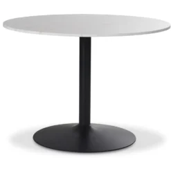 Ett runt matbord i stilren och modern design med toppskiva i äkta ljus marmorsten. Trumpetfot i pulverlackad svart metall.