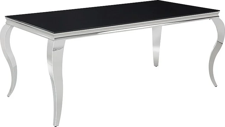 Matbord med skiva av glas och underrede av metall.