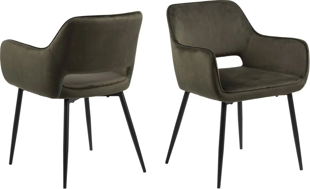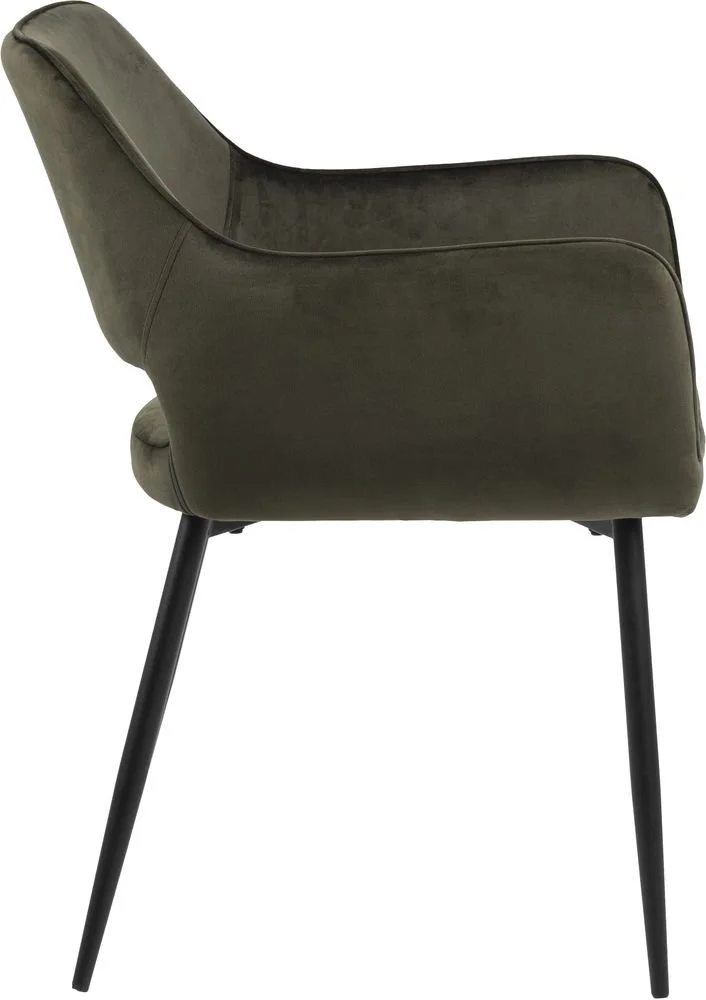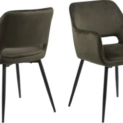 Matstol med underrede tillverkat i svart pulverlackerad metall och sitsen är klädd med ett behagligt olivgrönt tyg.